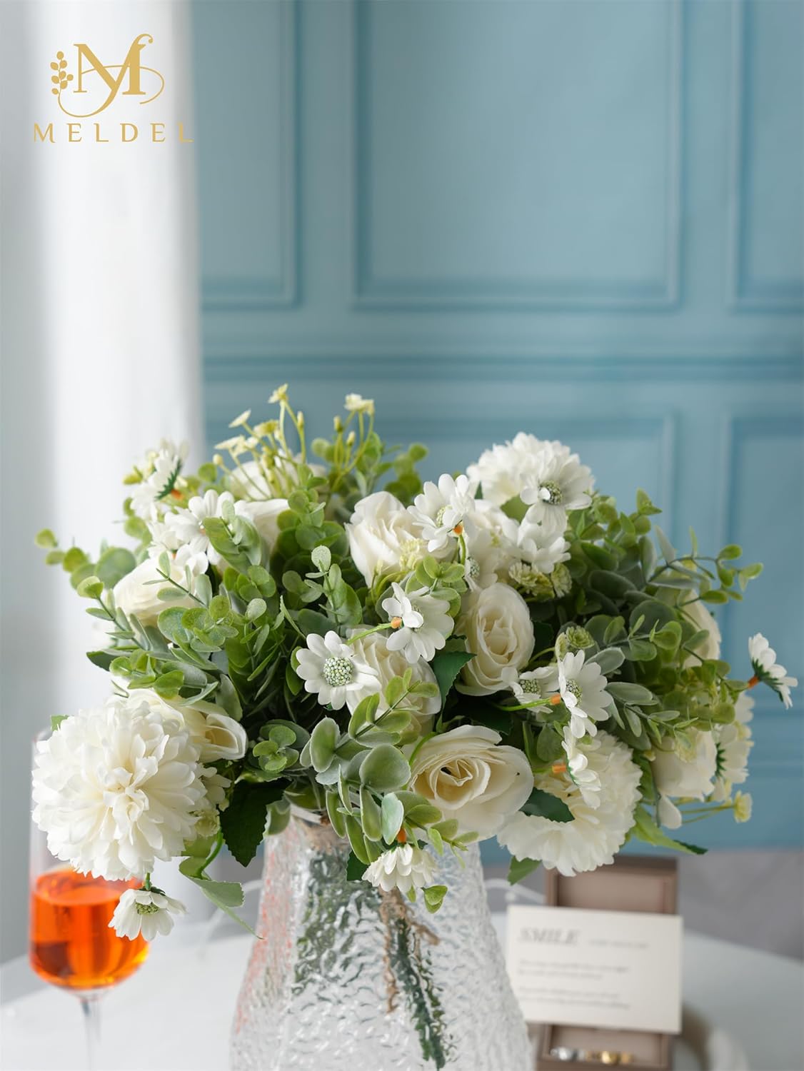 Meldel 3 Pcs Bouquet Rose Artificial Fake Flowers Eucalyptus Plants Faux Silk Flower Arrangements Wedding Bouquets Decorations Floral Table Centerpieces for Home Kitchen Garden Party Decor (White)