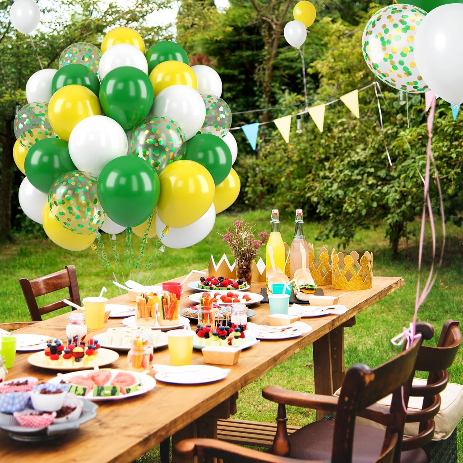 • What You Get - The green and yellow balloons include 50 balloons, 4 distinct colors: dark green balloons x 15, white balloons x 15, yellow balloons x 15, confetti green-gold balloons x 5. Accompanying by a 10m ribbon. These striking and captivating hues will beautifully enhance your memorable and enjoyable moments!