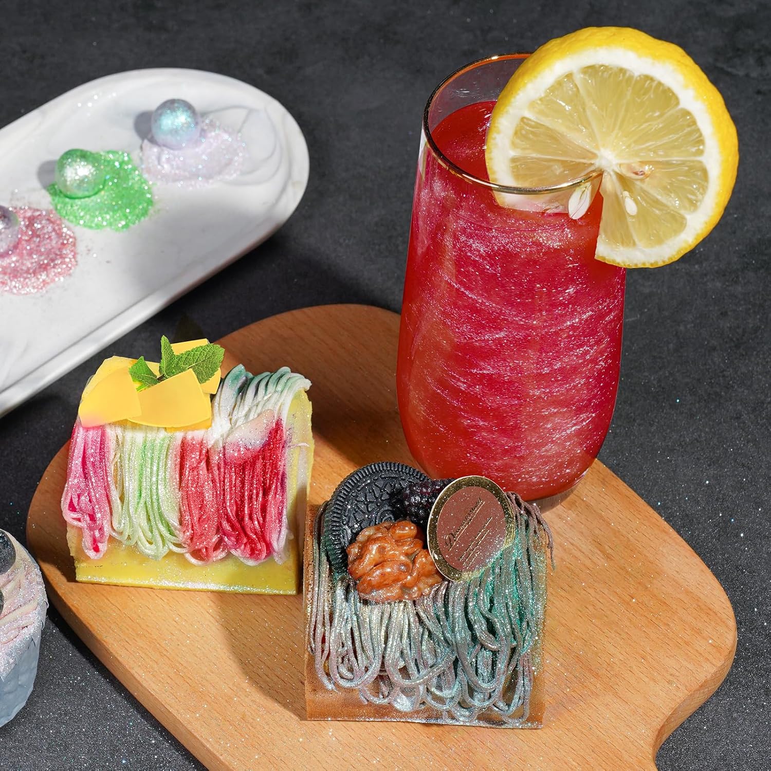 • 🌟【Use with Brews】Food-grade glitters are so fun and simple to use with brews. Add one pinch or two directly to your favorite beverage, mix it with cocktail syrups, juices, liqueurs, liquors, or spirits. Use a clear glass instead of opaque containers so that the liquid looks so cool, especially when you move it around in the glass with a stir. A tiny amount of dust can create a great visual spectacle, and clear liquids offer a great blank canvas for glitter to show off the best ability.
