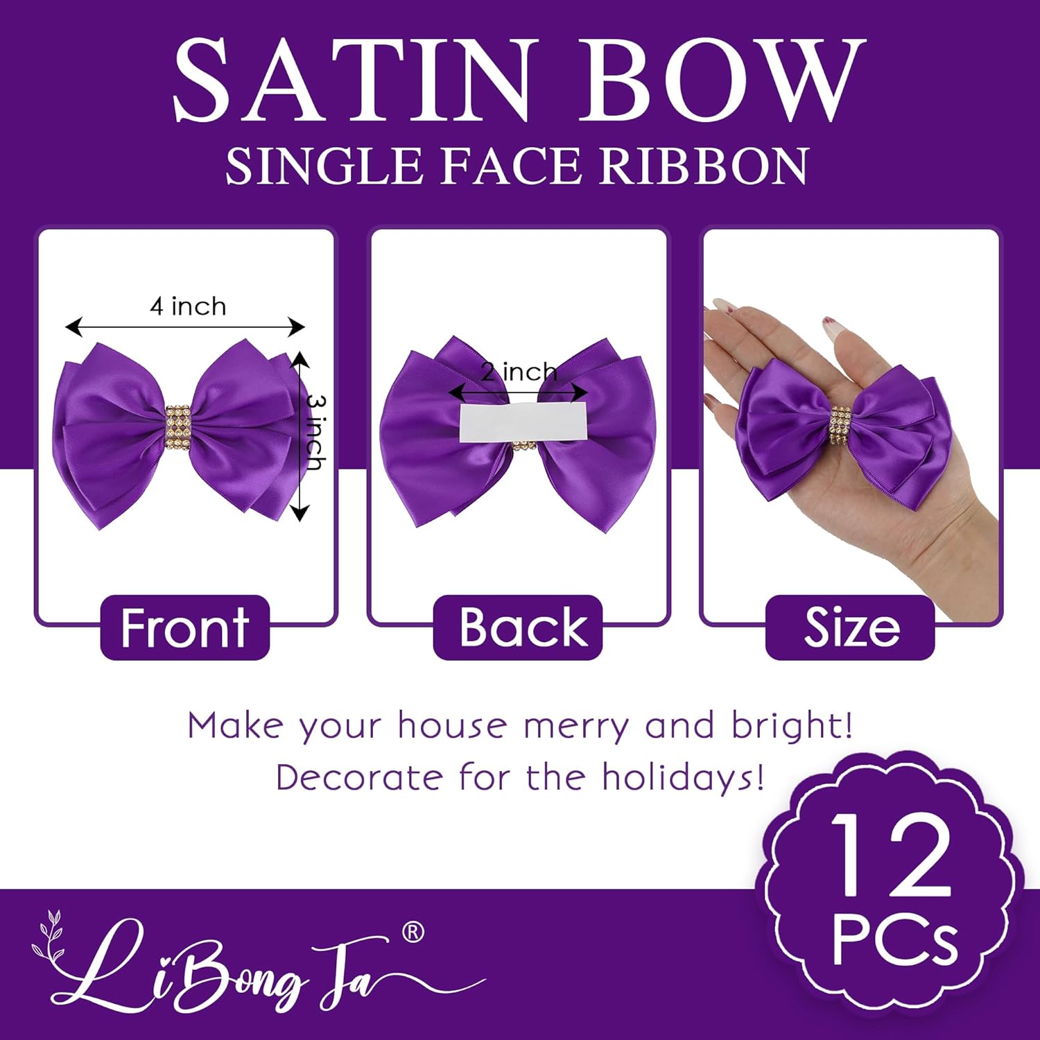 Purple Ribbon Bow 4'' Premade Satin Bow, Purple Gift Bows with Rhinestone, Wrapping Bows for Presents, Greeting Cards, Treat Bags, Wine Bottles, Valentines Bows for Gift Wrapping-12 Counts