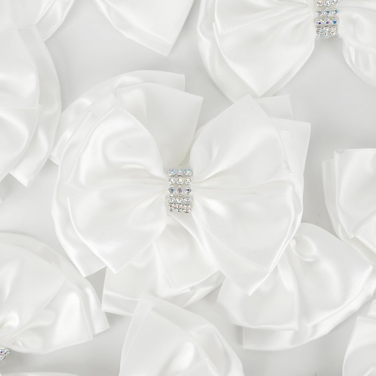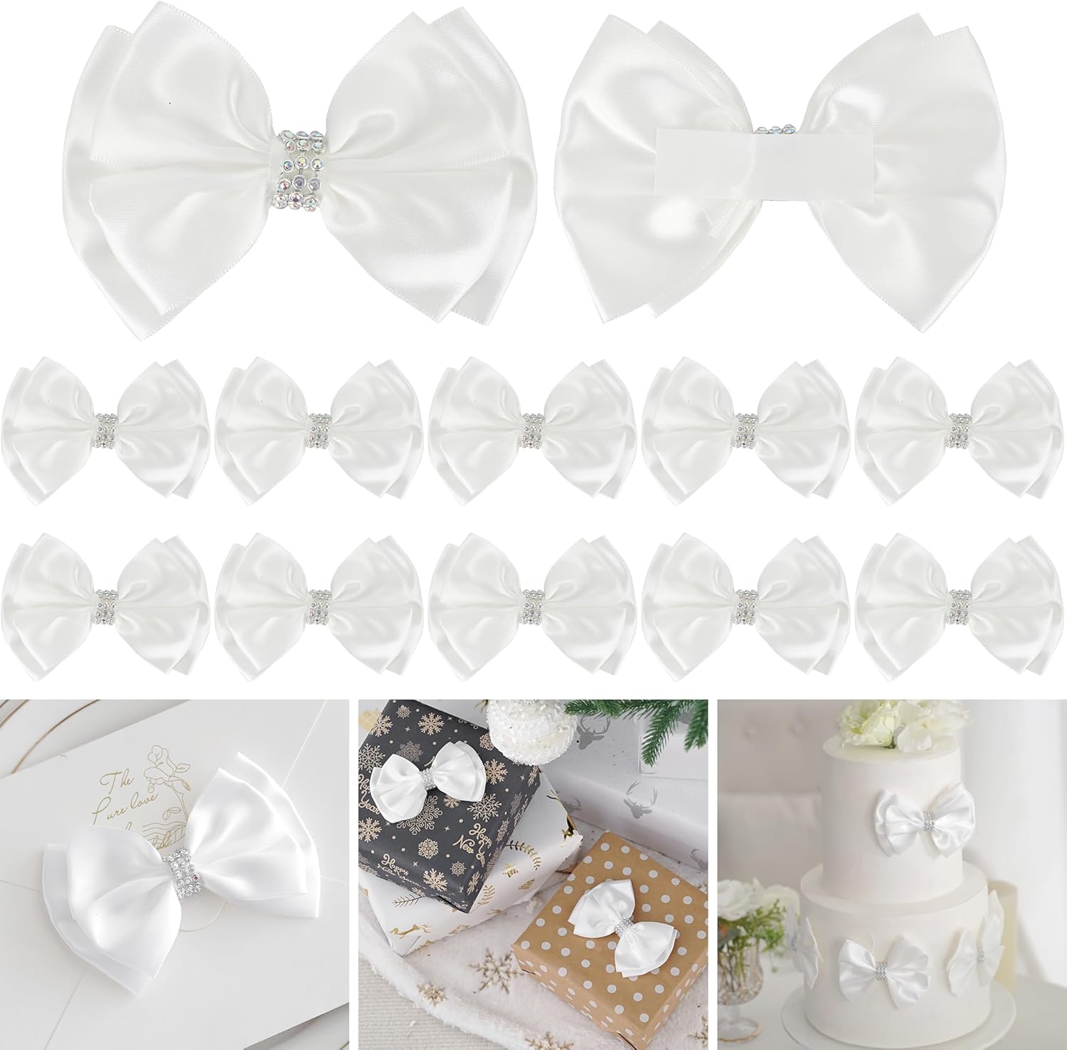 White Satin Bows 4'' Premade White Ribbon Bows, Gift Bows with Rhinestone, Wrapping Bows for Presents, Greeting Cards, Treat Bags, Wine Bottles, Valentines Bows for Gift Wrapping-12 Counts