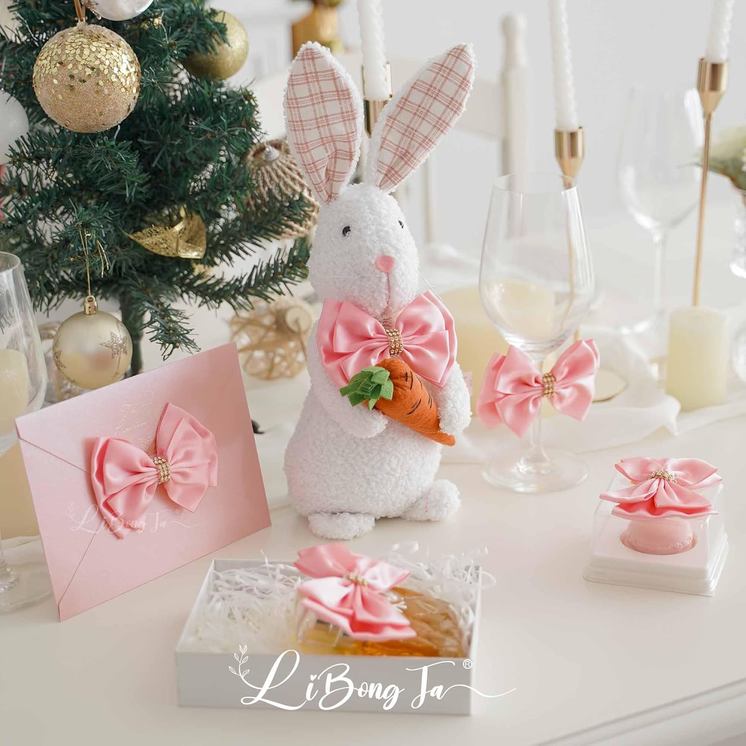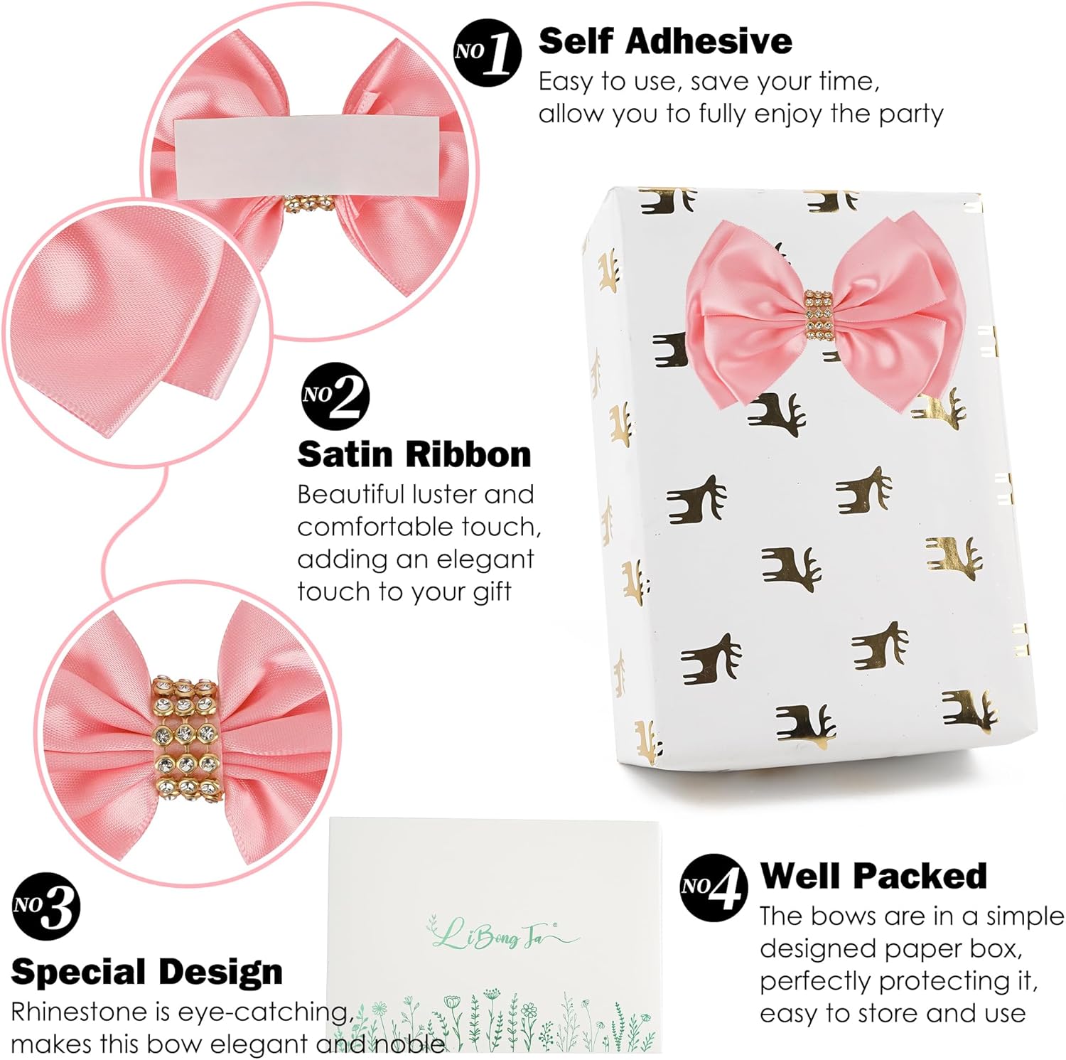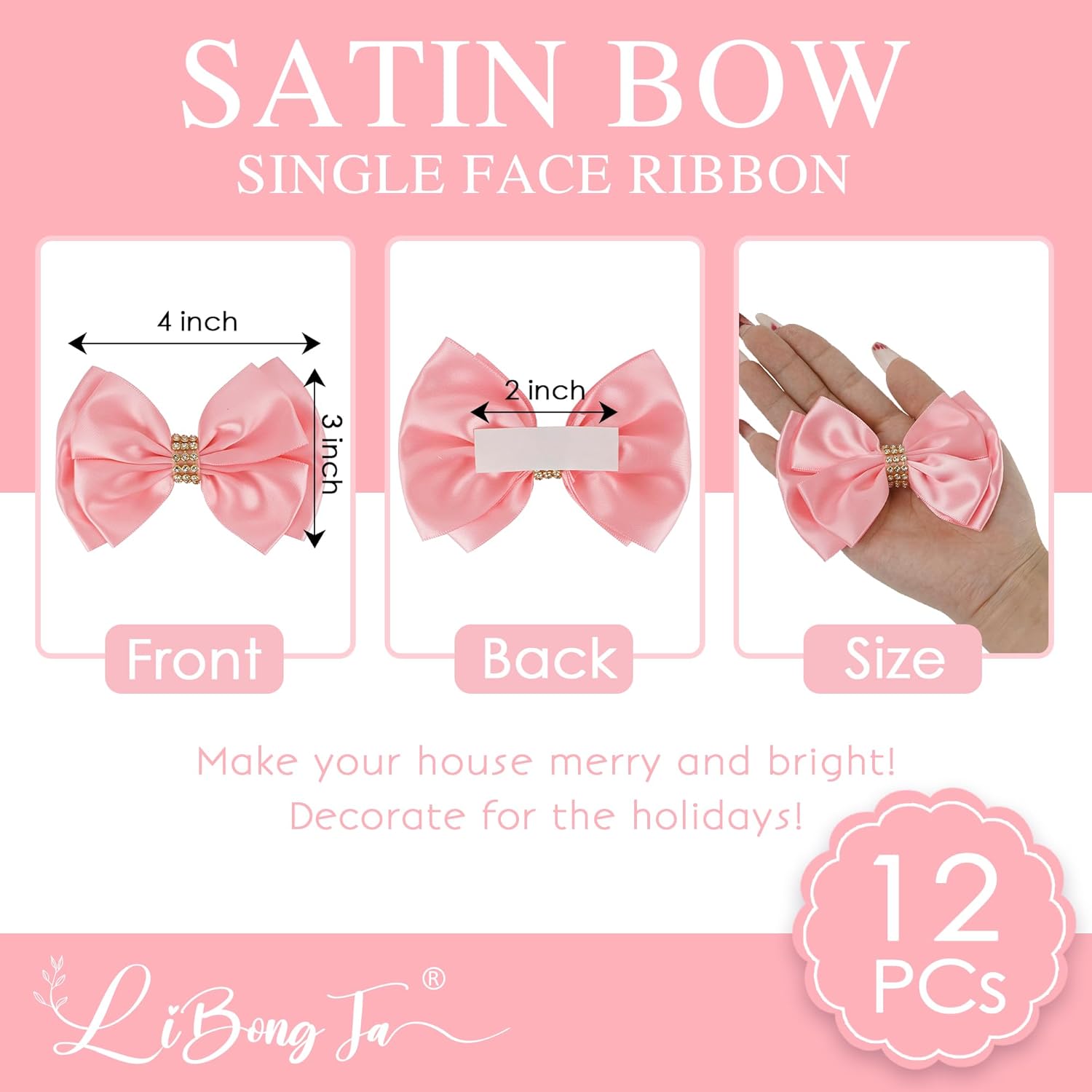 Pink Ribbon Bow 4'' Premade Pink Satin Bow, Gift Bows with Rhinestone, Wrapping Bows for Presents, Greeting Cards, Treat Bags, Wine Bottles, Pink Valentines Bows for Gift Wrapping-12 Counts