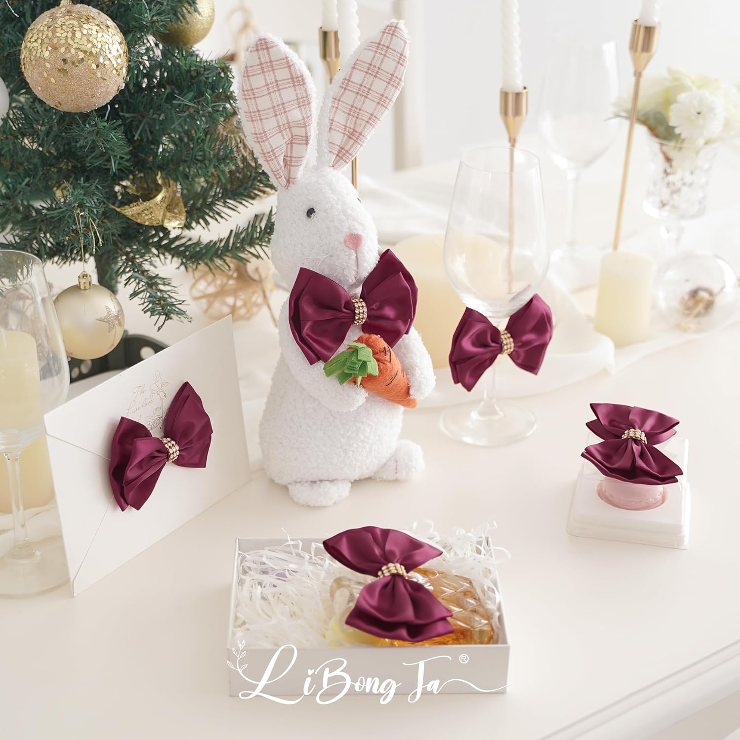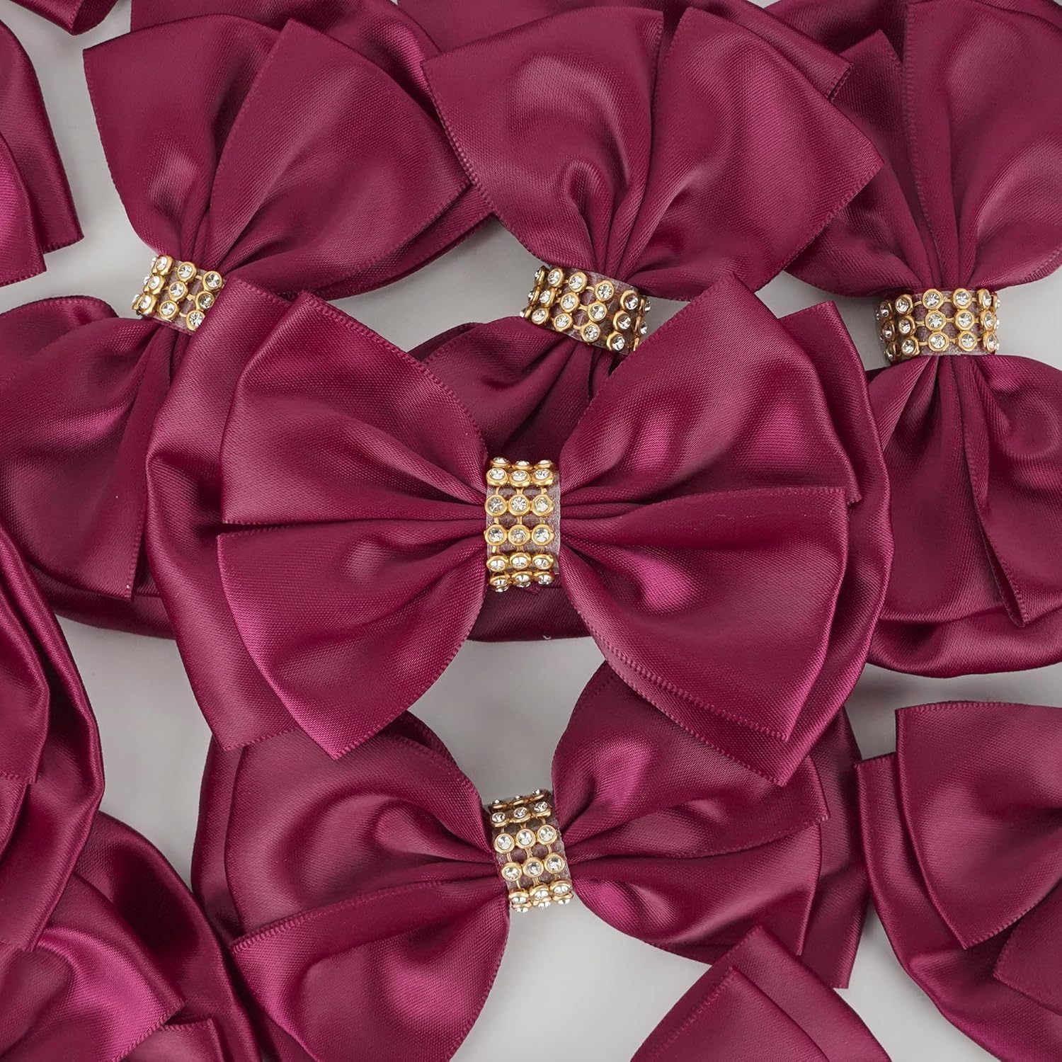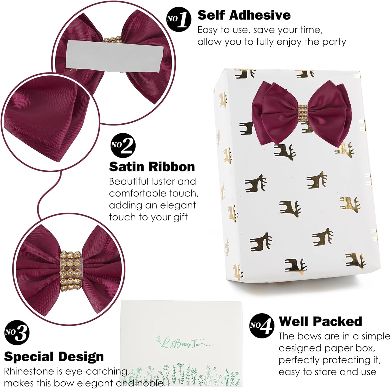 Dark Red Ribbon Bow 4'' Premade Satin Red Bows, Burgundy Gift Bows with Rhinestone, Wrapping Bows for Presents, Greeting Cards, Treat Bags, Valentines Bows for Gift Wrapping-12 Counts