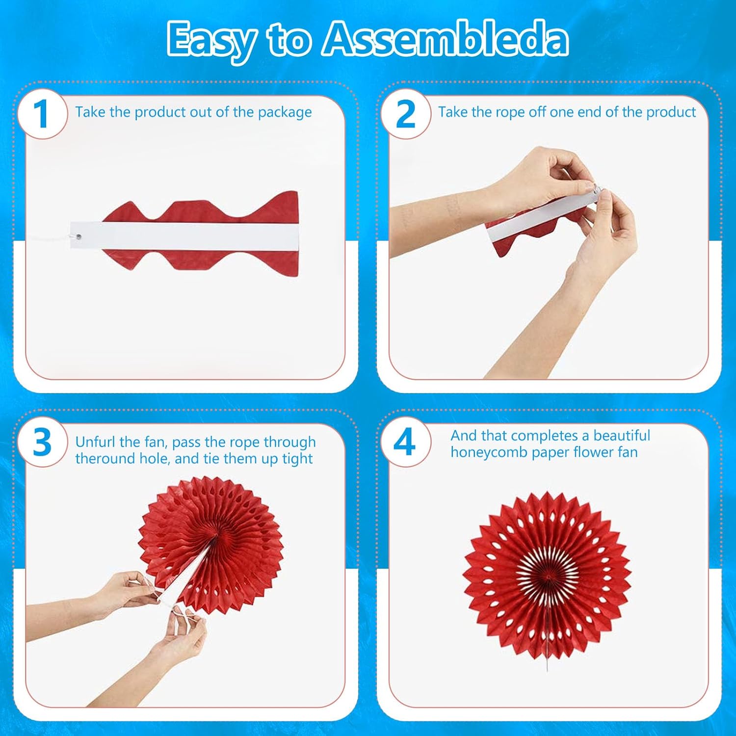 • 【Hanging paper fan set】Paper fan set includes 20 paper fans of different sizes, among which the paper flower fan size is 14 inches * 3, 12 inches * 5, 8 inches * 6, and 6 inches*6.
