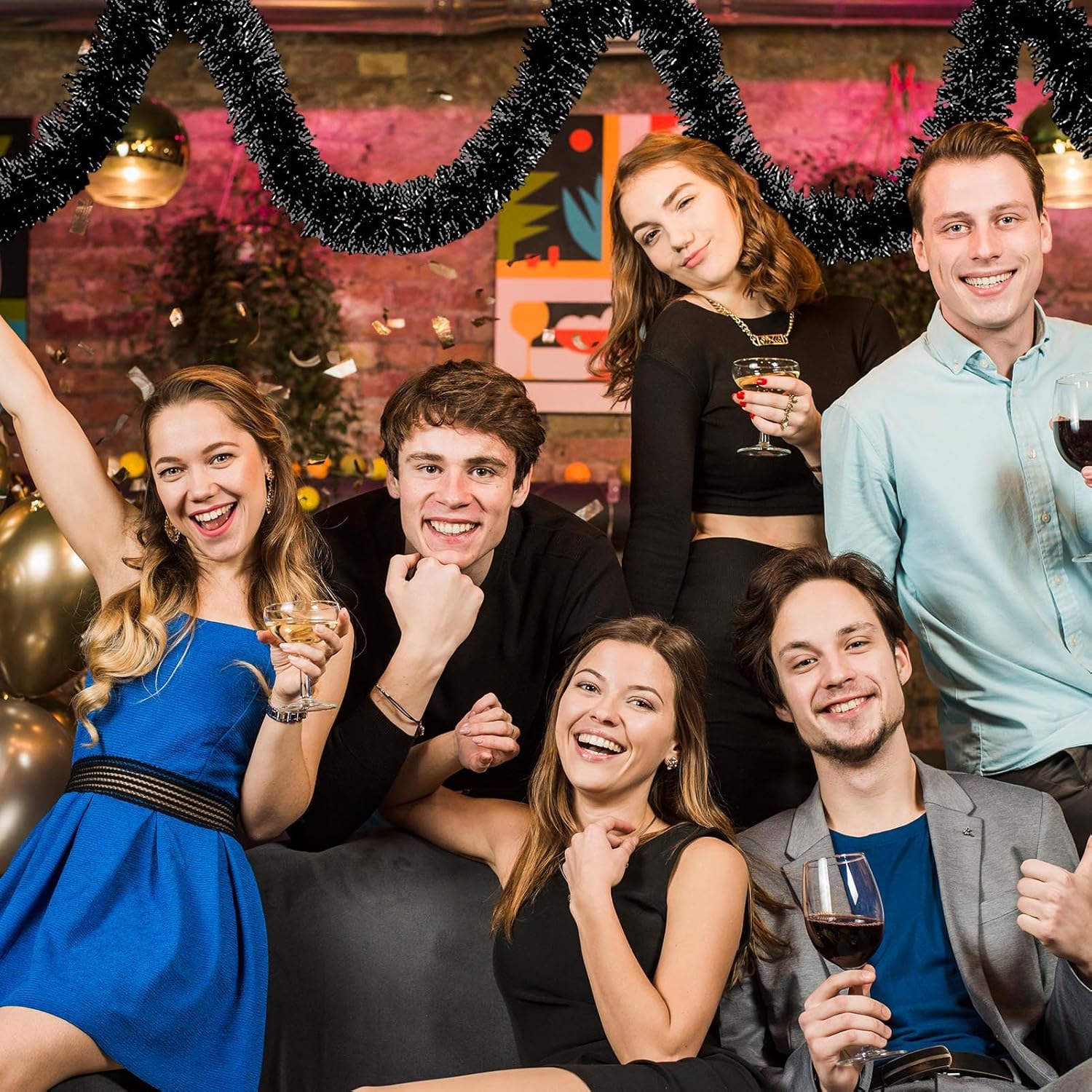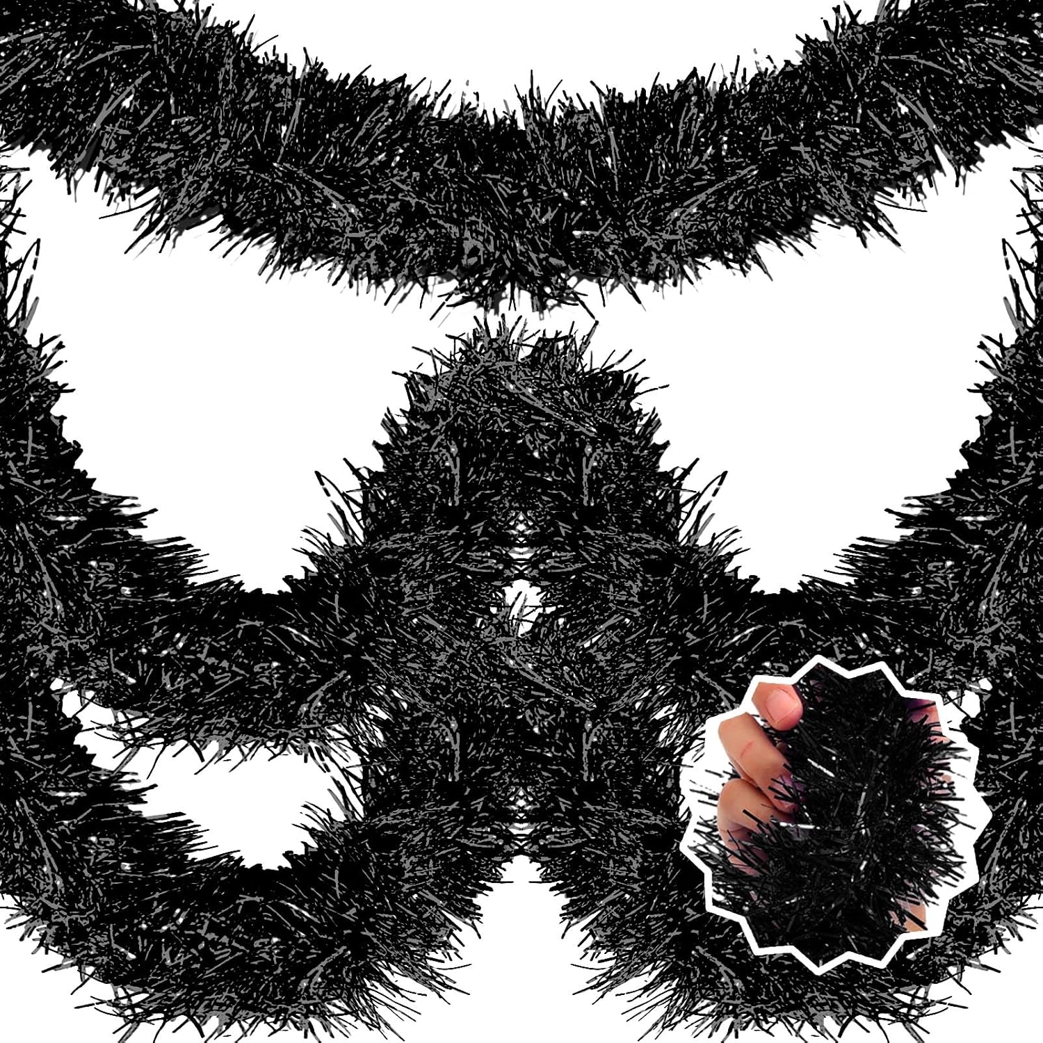 25 Feet Black Christmas Tinsel Garland, Metallic Foil Twist Banner Wall Hanging Tinsel Streamers Backdrop for Parade Floats, Christmas, Mother's Day, Birthday Party Decorations(4in x 25ft)