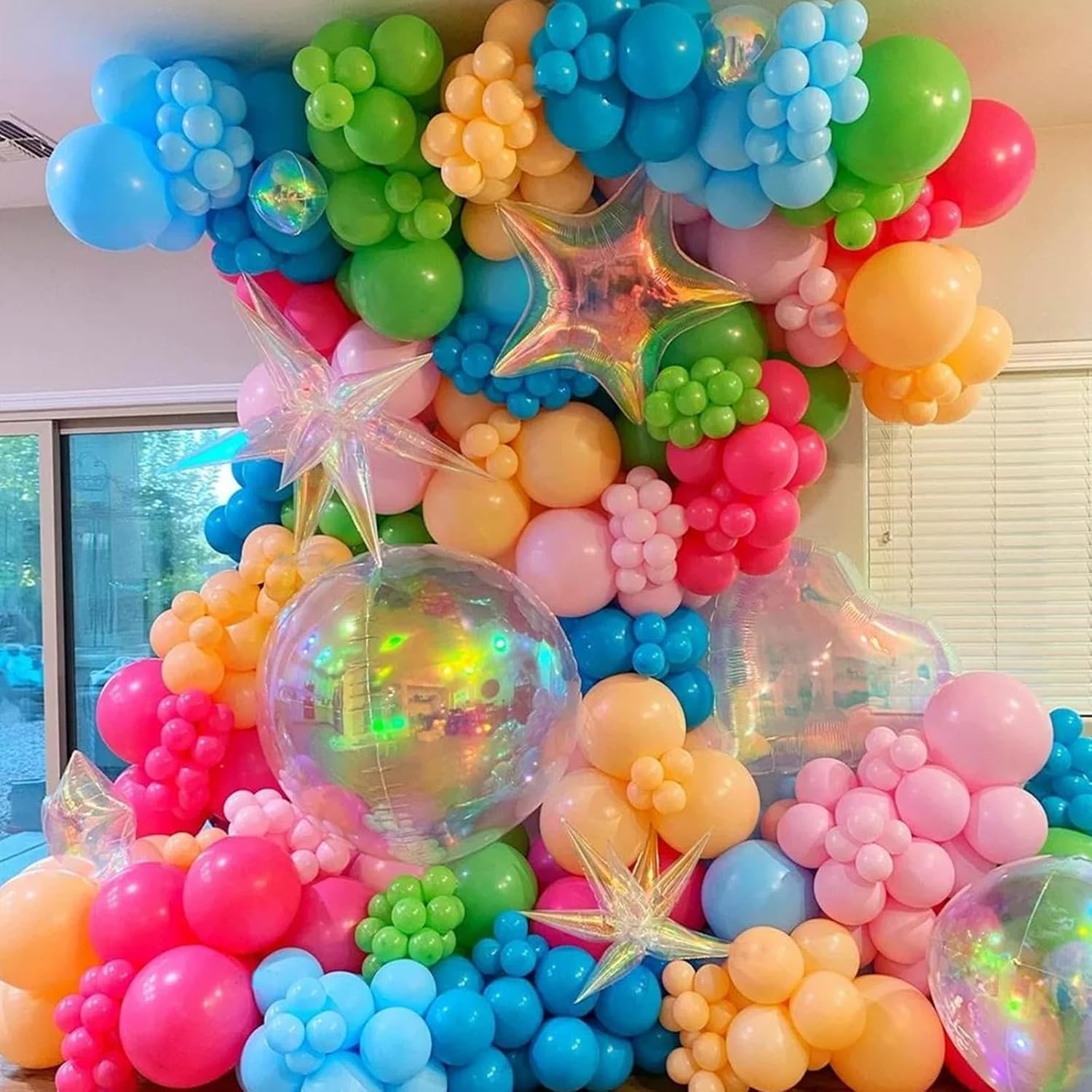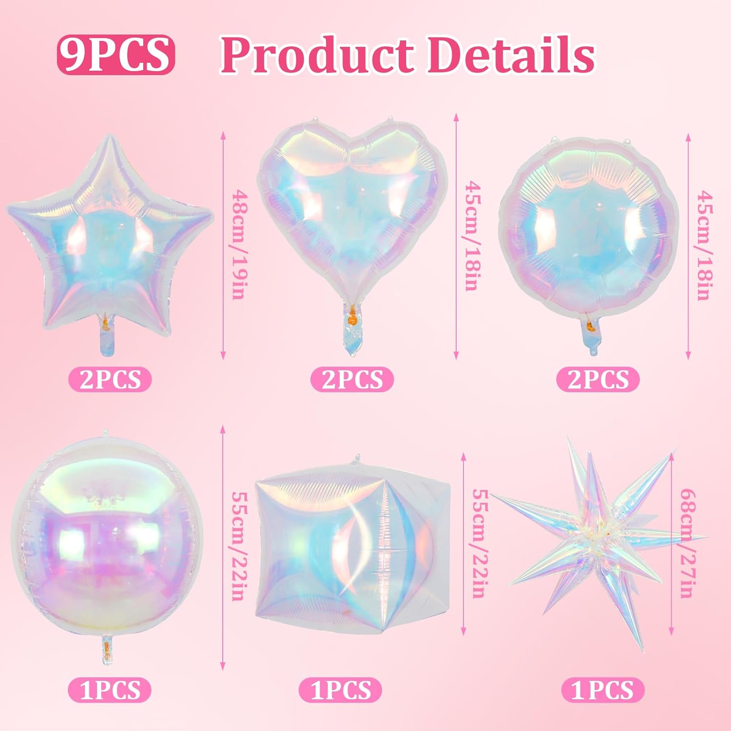 • Vibrant Decorations: Elevate your party with this set of 9 iridescent balloons in star, heart, starburst, laser 4D cube, and clear foil designs, ranging from 18-27 inches, 12pcs 48cm droplet shaped balloons (combined into 68cm explosion star balloons)