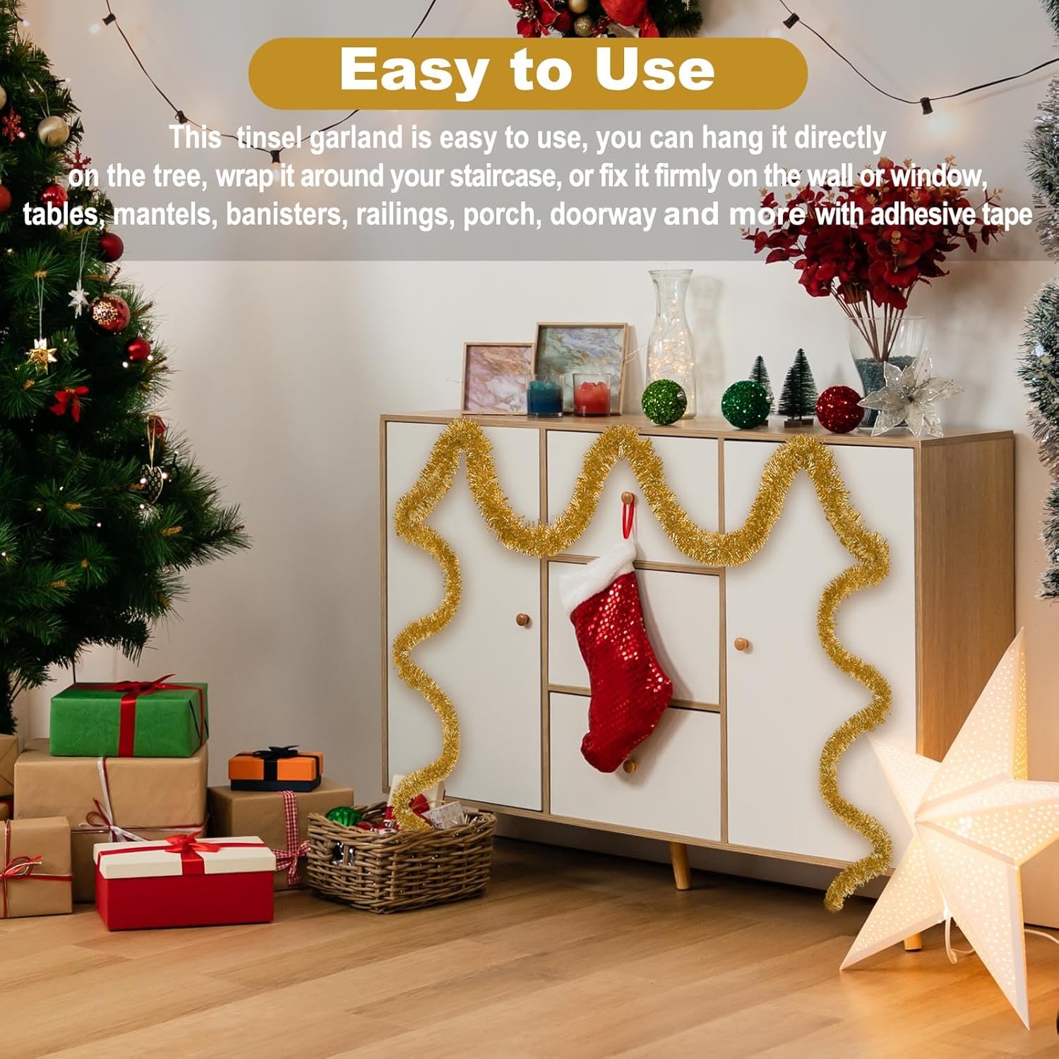 • Easy to Decor: Christmas tinsel garland include a soft, bendable wire inside, making them resistant to breakage and allowing you to shape them as you desire for your DIY Christmas tree decorations, can use glue to stick them up, also use scissors to cut to the right length, twist them into various shapes as you like, then hang it anywhere you want