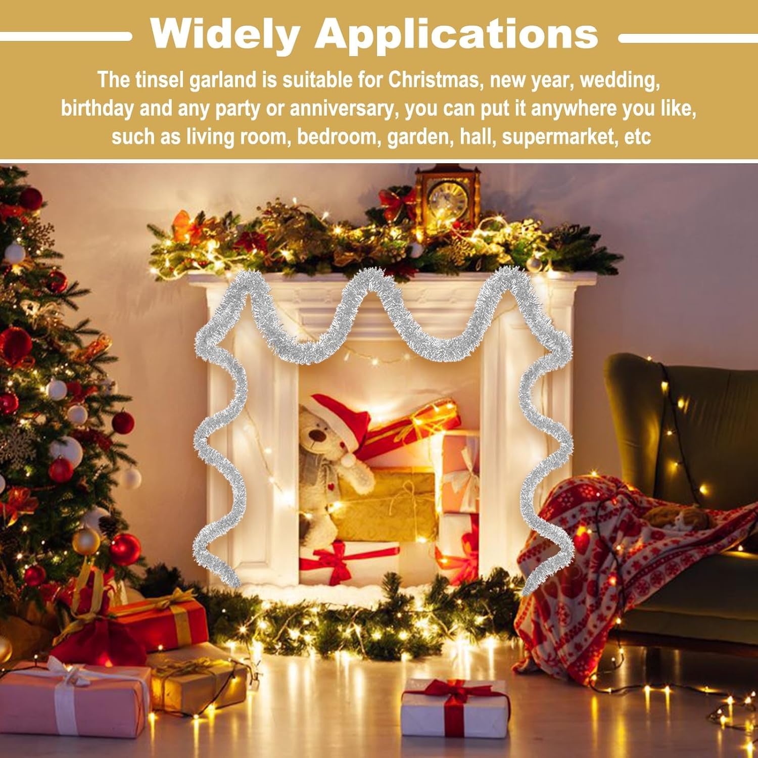 • Wide Application: Suitable for all kinds of special days, such as christmas, new year, valentine's day, halloween, festivals, wedding, engagement, bridal baby shower, graduation celebrations. The tinsel garland are perfect decorations for party, home decorations, parade float, garden, christmas tree, christmas wreath, wall, ceiling, door, hedge, stair rail, doorway, window, pole, table and so on