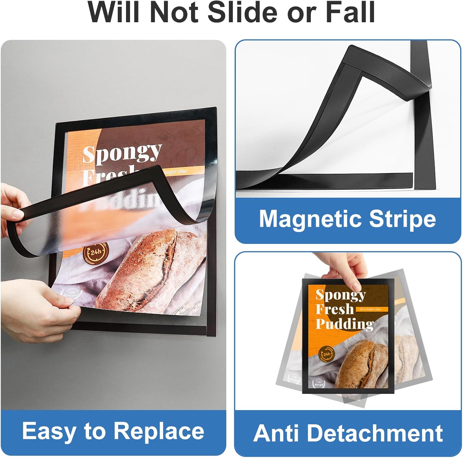 • ✔【Magnetic Frame is Easy to Replace】No tools or drilling are required. It is straightforward to use: just tear off the white protective film on the back, paste it on the smooth wall, open the front frame, and put in the notice/picture you want to display. The black magnetic borders can be attached. Perfect for businesses that need to swap and remove signs daily.