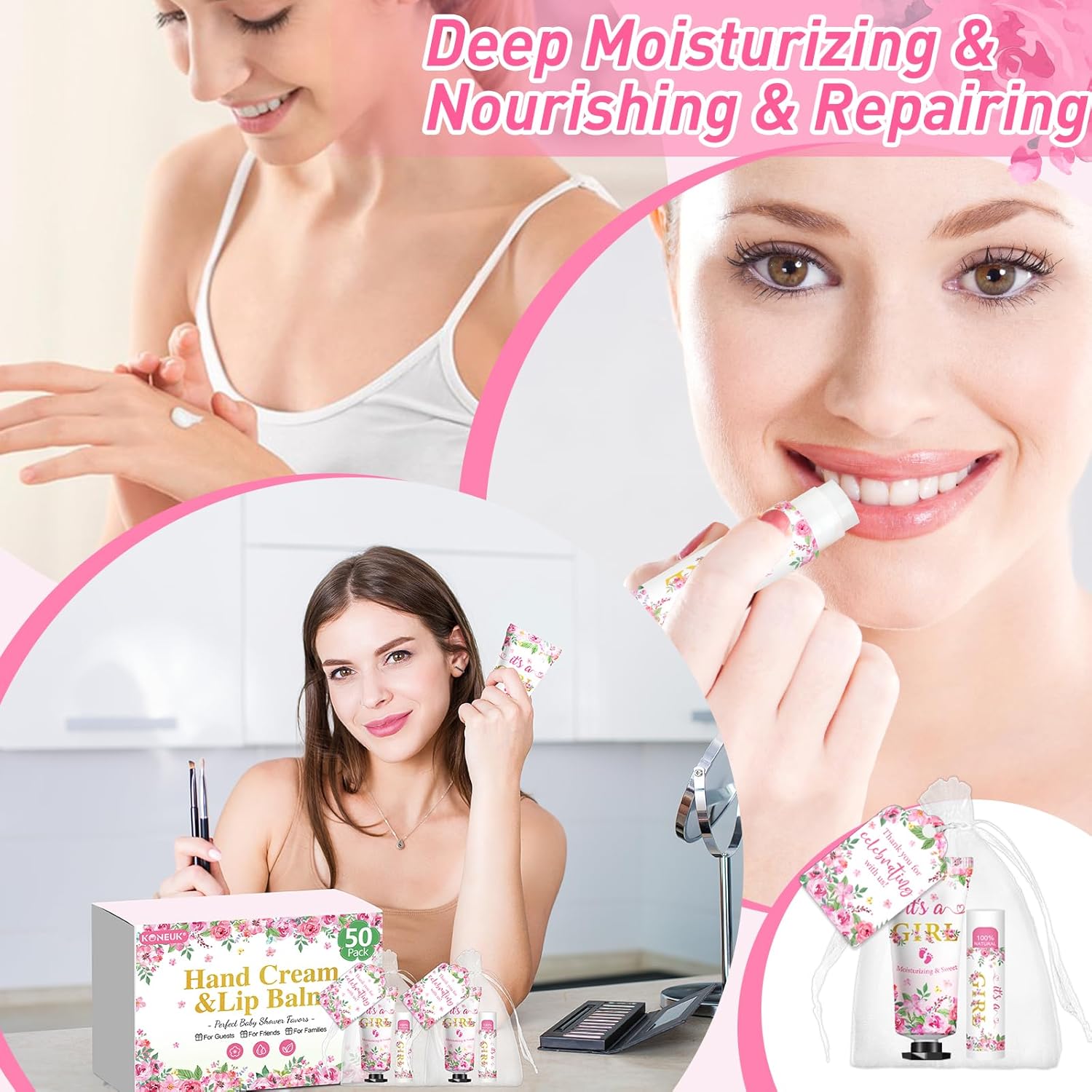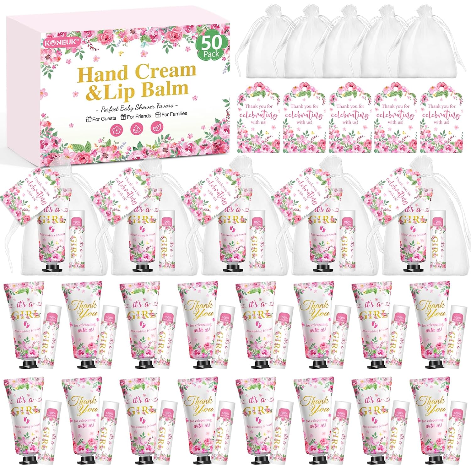50 Pack Bulk Hand Cream and Lip Balm Gifts Sets, Baby Shower Favors and Bridal Shower Favors for Guests with Thank You Card and Organza Gift Bags, Appreciation Gifts, Wedding Party Favors (Baby Girls)