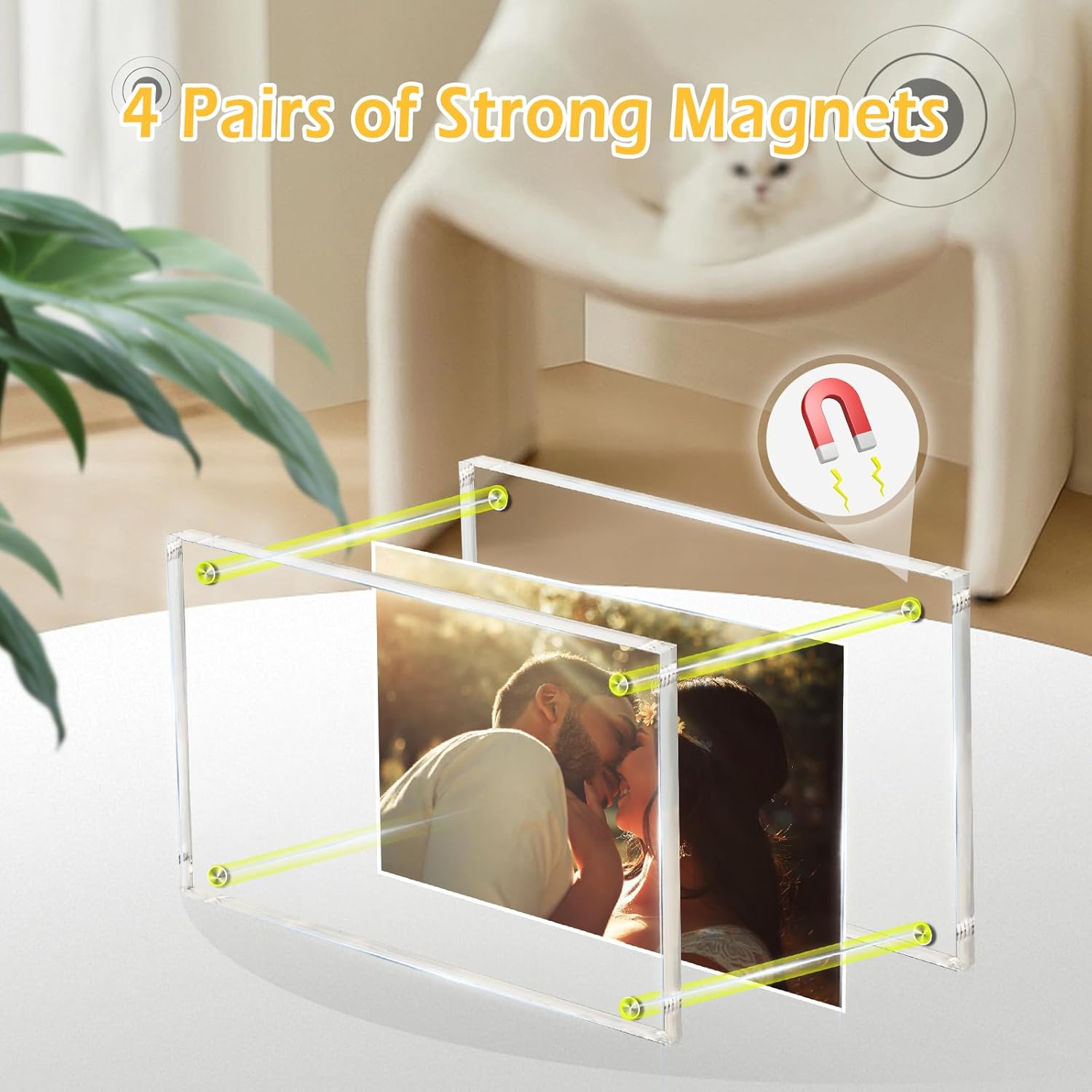 • Magnets Picture Frame: This picture frame made of 2 premium clear acrylic panels and 1 acrylic base. Two panels are held together by four pairs of magnets. With those strong magnets,the frames are very easy to use. Just seperate 2 panel and put the photo in, the magnets will holds the photo, then put the panel on the base, you will get a beautiful tabletop frame