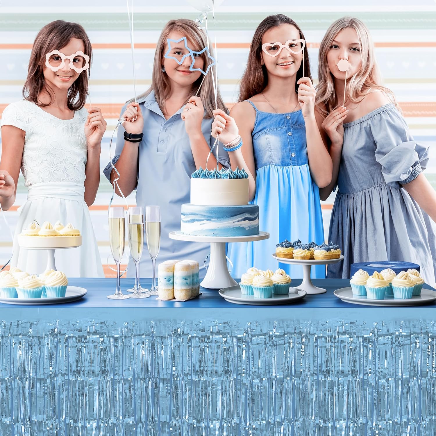 2 Pack Light Blue Table Skirts, 29x108" Metallic Foil Tinsel Fringe Table Skirts for Rectangle Tables Streamer Curtains Backdrop, Party Decorations for Birthdays Weddings Holidays