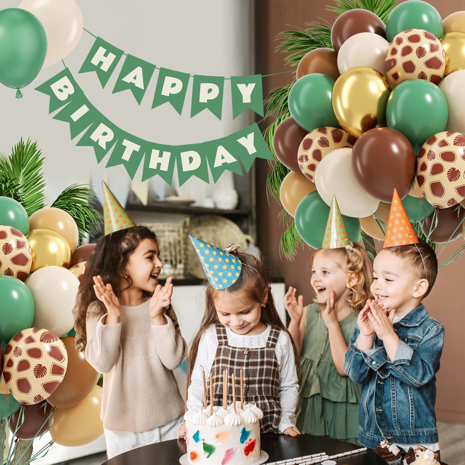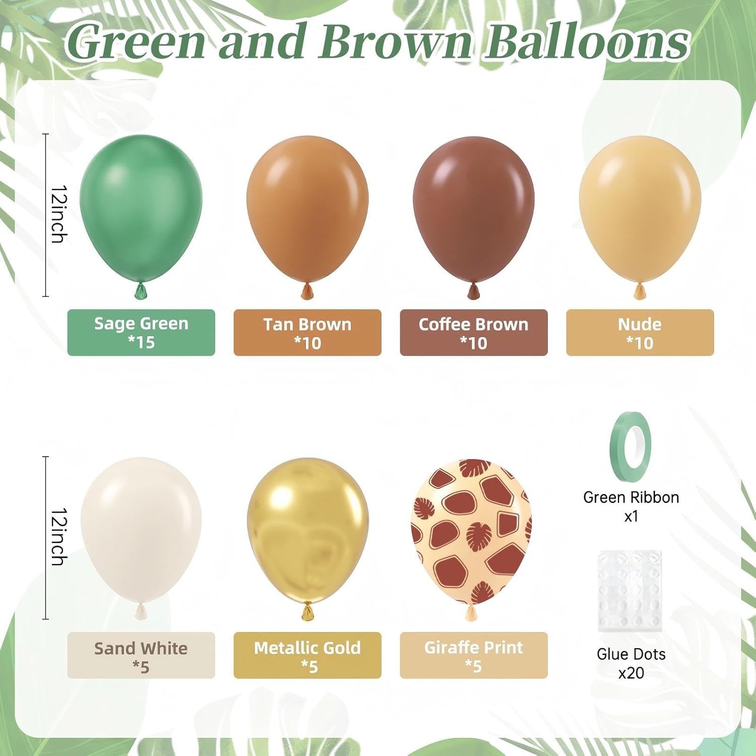 • Package Include: The jungle balloons include sage green balloonsx15, coffee brown balloonsx10, light brown ballonsx10, nude balloonsx10, sand white balloonsx5, metallic gold balloonsx5, giraffe print balloonsx5, glue dotsx20, green ribbonx1, decorative stripx1