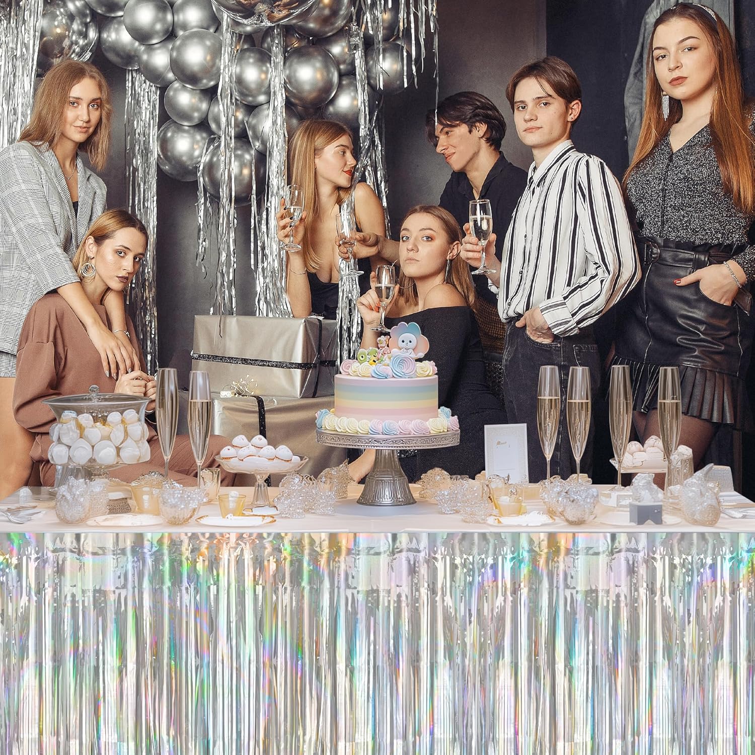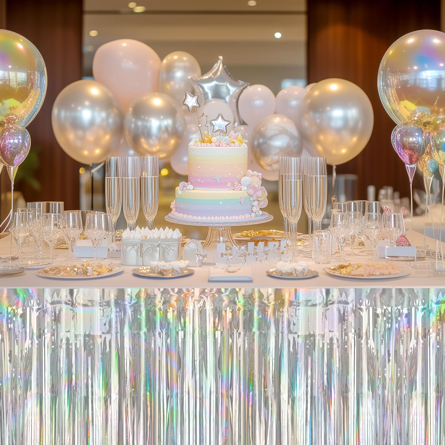 • Make a Spectacle of Color: Make your party a spectacular light show with our bundle of 2 Reversible Rainbow Table Skirts. Dazzle guests in vibrant, shimmering hues that shift in the light.