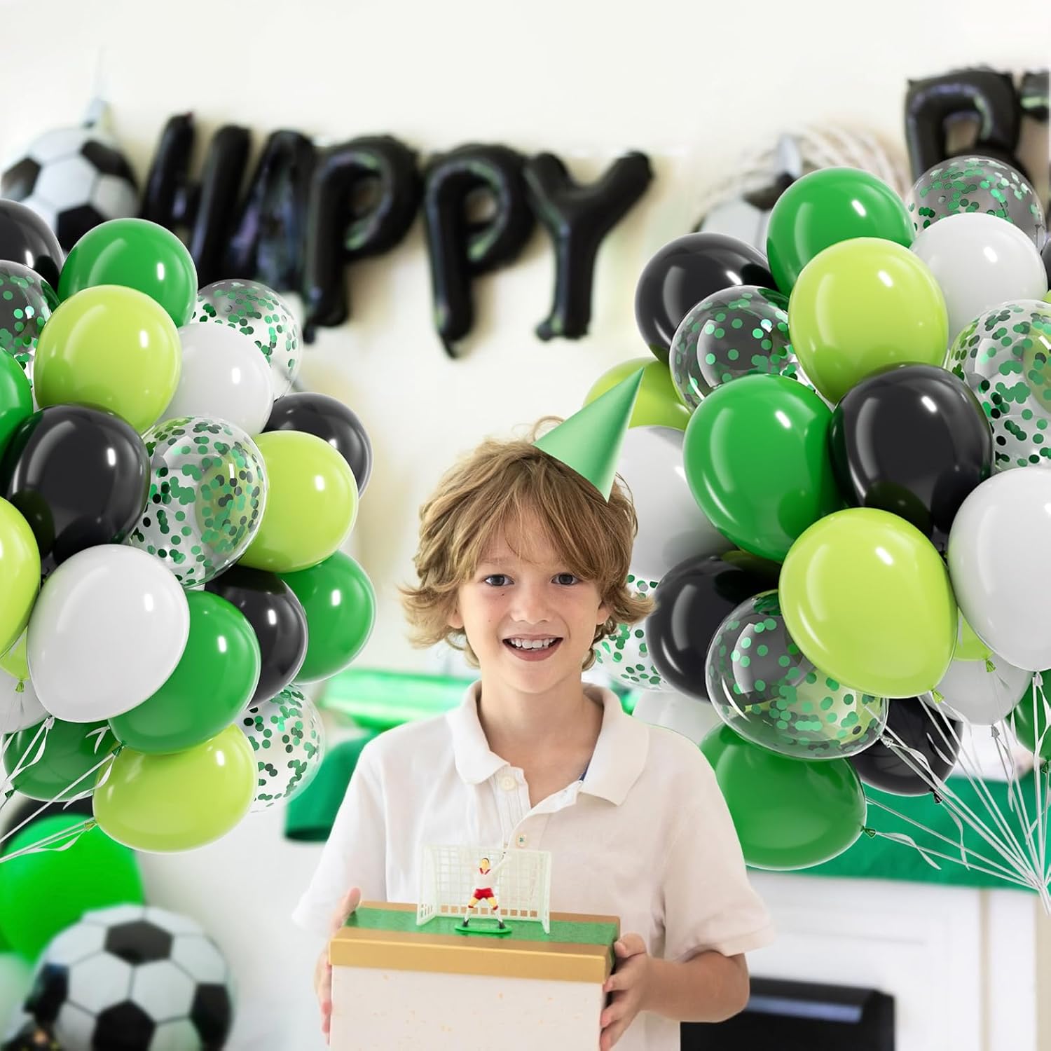 • Package Include: The green and white balloons include 12inch green balloonsx15, 12inch lime green balloonsx15, 12inch black balloonsx10, 12inch white balloonsx10, 12inch green confetti balloonsx10, glue dotsx20, white ribbonx1