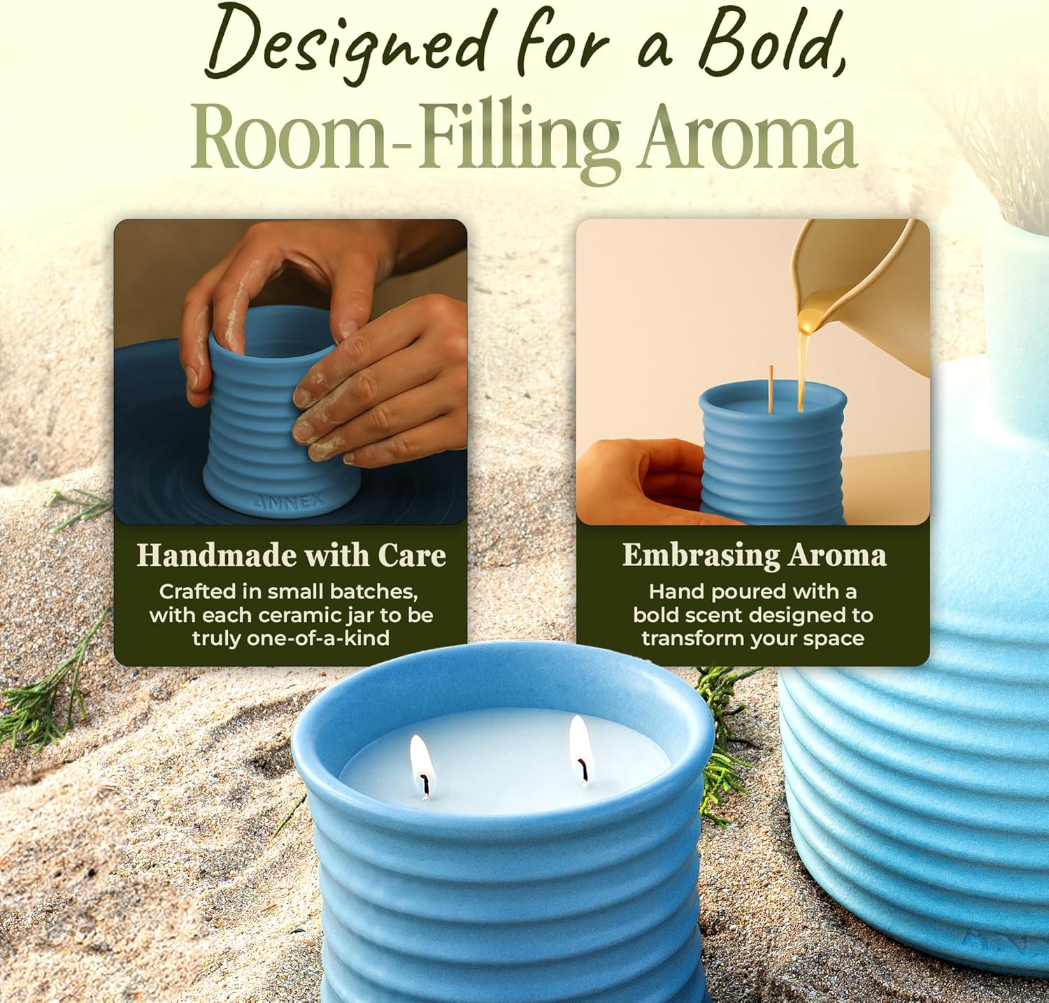 Scented Luxury Candles in Handmade Ceramic Jars, Soy Wax | Day On The Sea – Cypress & Cedar, Large Candle | Non Toxic, 2 Wicks, Reusable Big Blue Jar | Natural Spring Aromatherapy for Women & Men