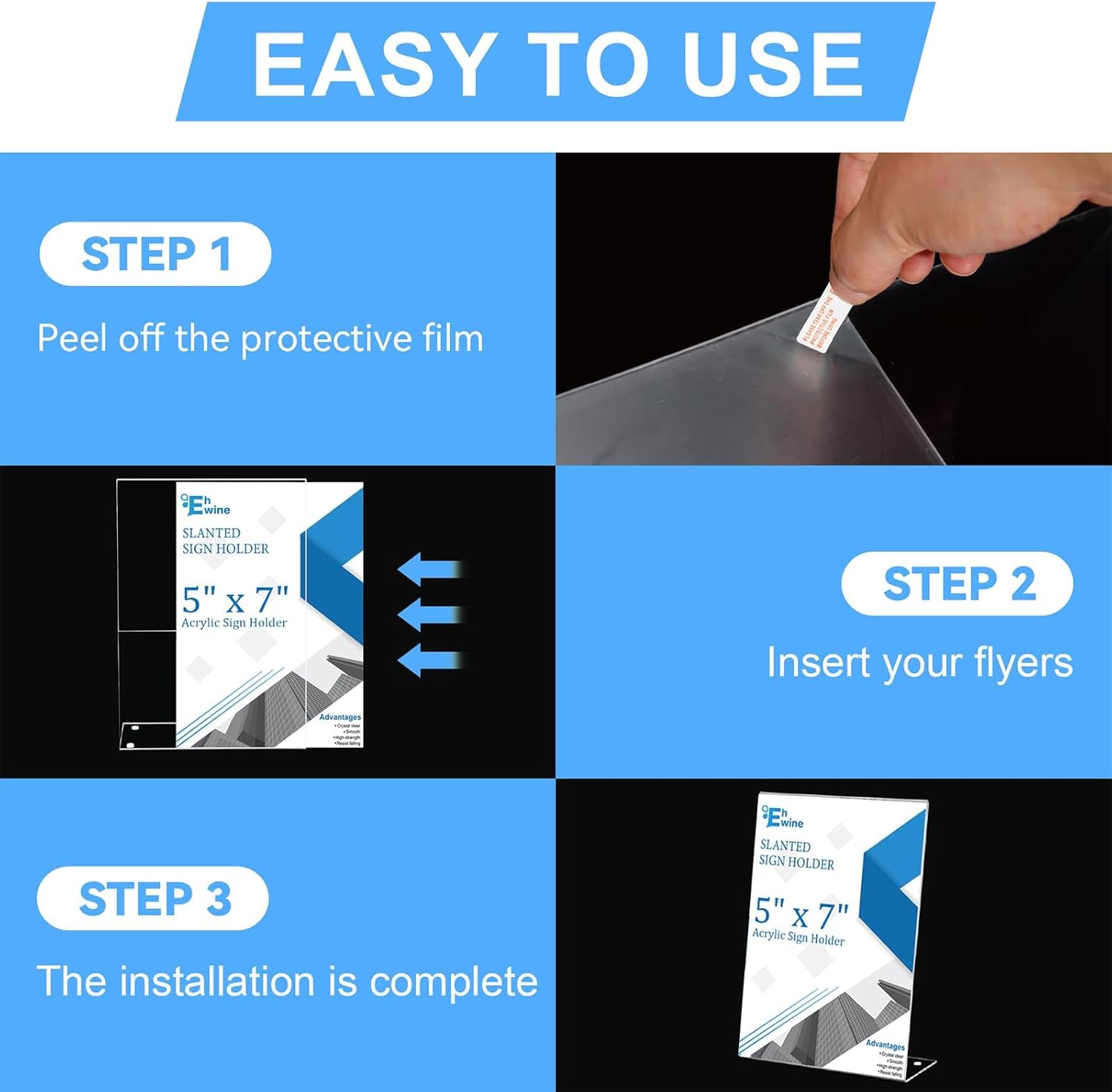 • Easy to Use: Each of our Acrylic Sign Holder comes with a peel off film guide, follow the red arrows to peel off the film in seconds, and the plastic sign holder has an opening on its side for easy paper insertion