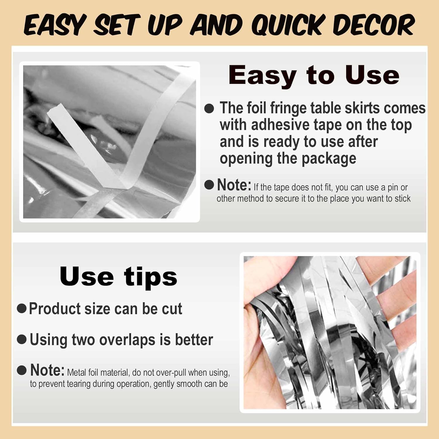• Easy to Use: Each metallic fringe table skirts comes with self-adhesive tape on the top for easy attachment to your wall or table, just peel off the tape and then stick, easy and fast to install.