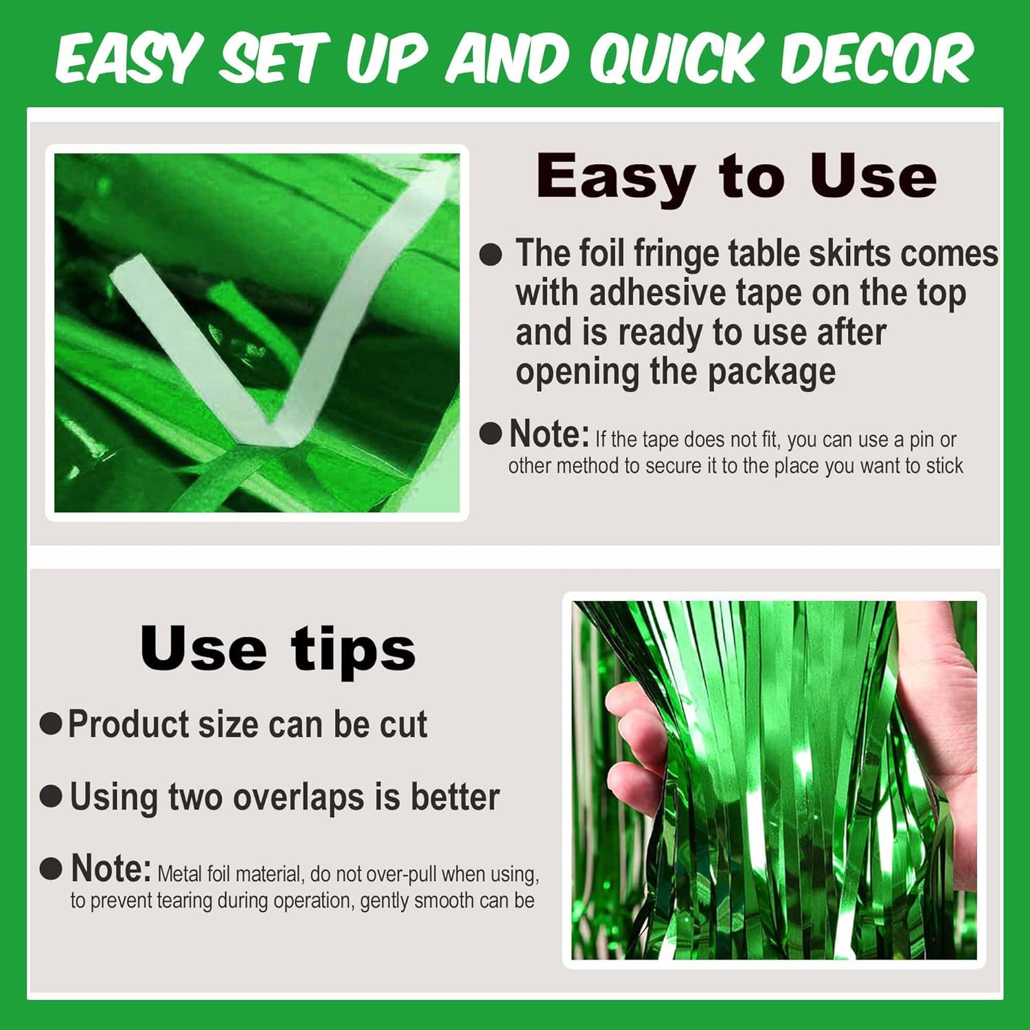 3 Pack 29 x108 Inch Green Foil Fringe Table Skirts Metallic Banner for Tinsel Streamer Garland Backdrop for Parade Floats Mother's Day, Graduate, Birthday, Wedding Party Decoration