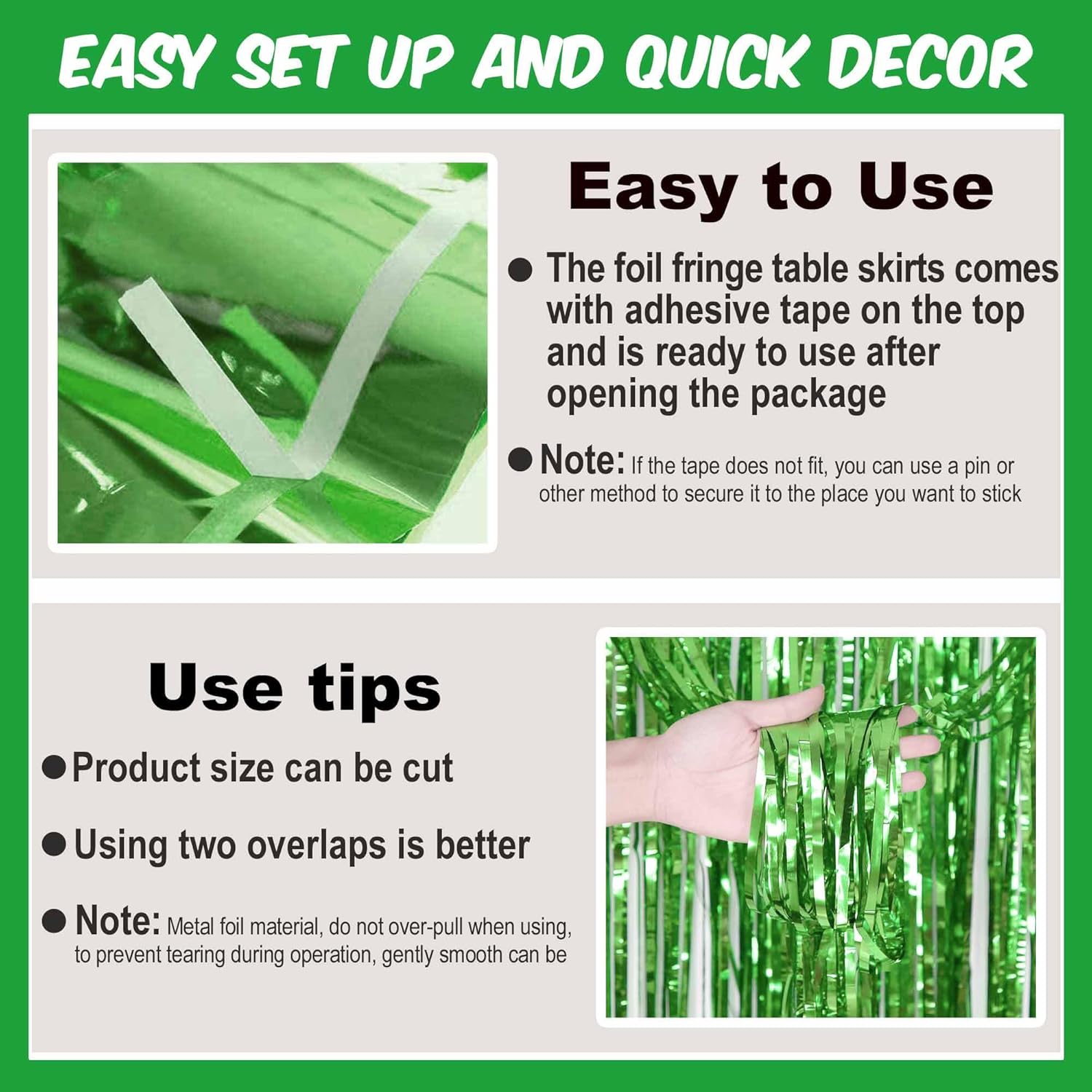 • Easy to Use: Each metallic fringe table skirts comes with self-adhesive tape on the top for easy attachment to your wall or table, just peel off the tape and then stick, easy and fast to install.