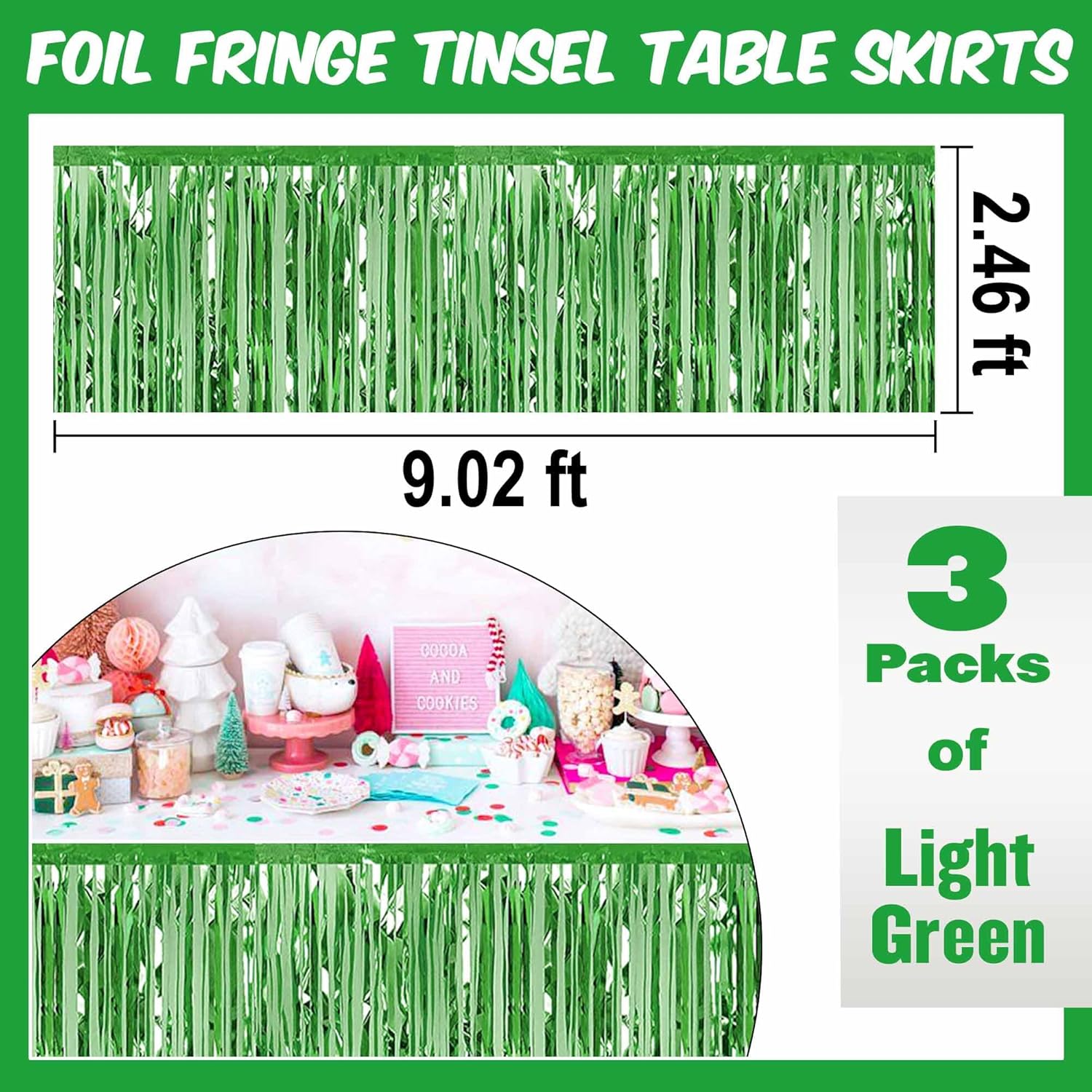 3 Pack 29 x108 Inch Light Green Foil Fringe Table Skirts Metallic Banner for Tinsel Streamer Garland Backdrop for Parade Floats Mother's Day, Graduate, Birthday, Wedding Party Decoration