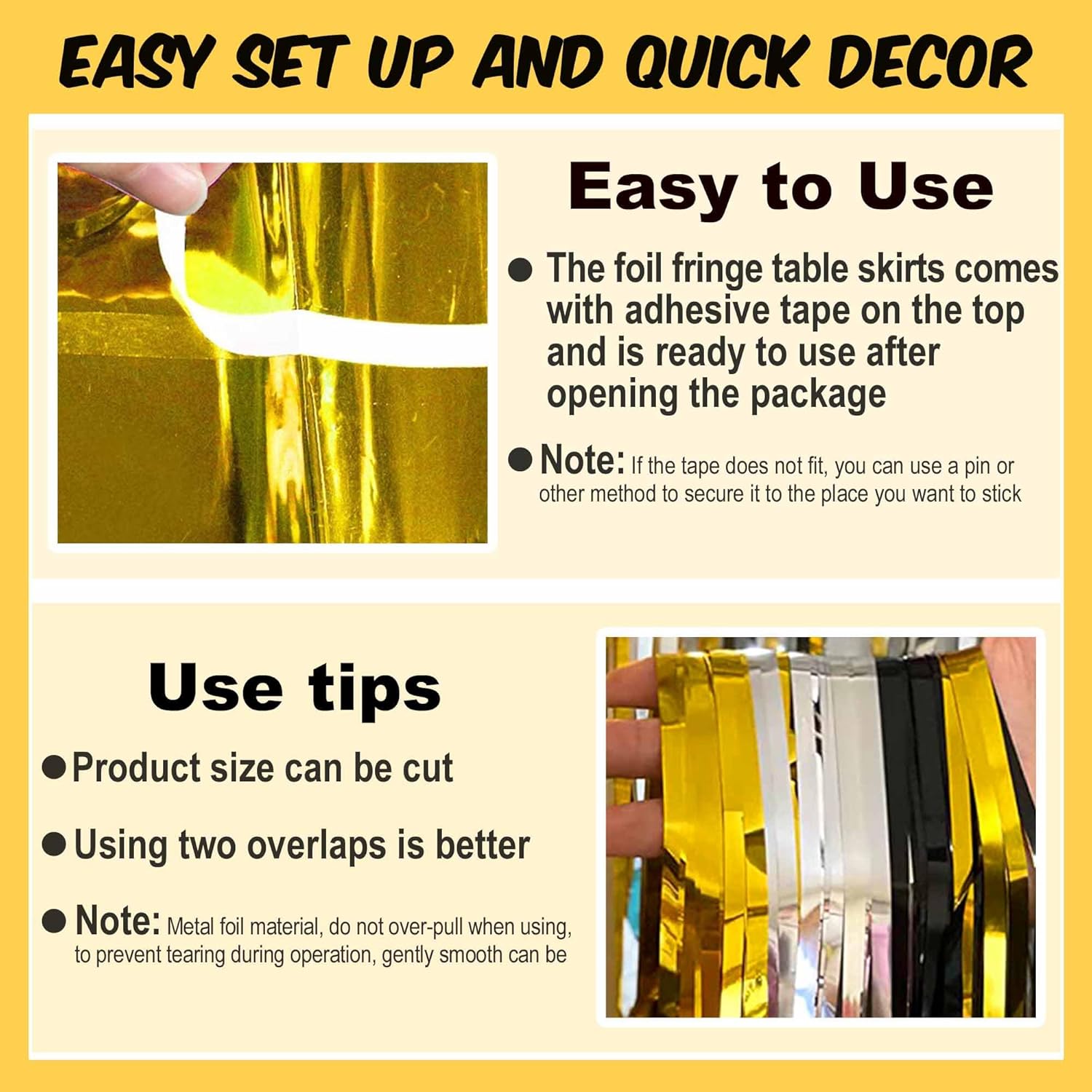• Easy to Use: Each metallic fringe table skirts comes with self-adhesive tape on the top for easy attachment to your wall or table, just peel off the tape and then stick, easy and fast to install.