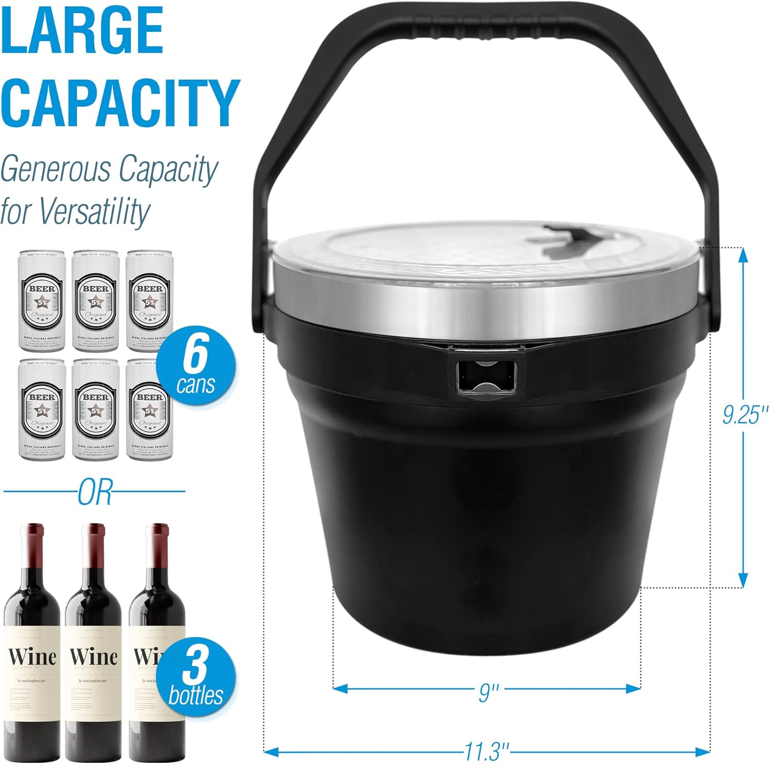 • Extra Large Ice Bucket for Parties; Holds 256 oz of ice or 3 bottles of wine; Perfect for gatherings, BBQs, or champagne nights with friends