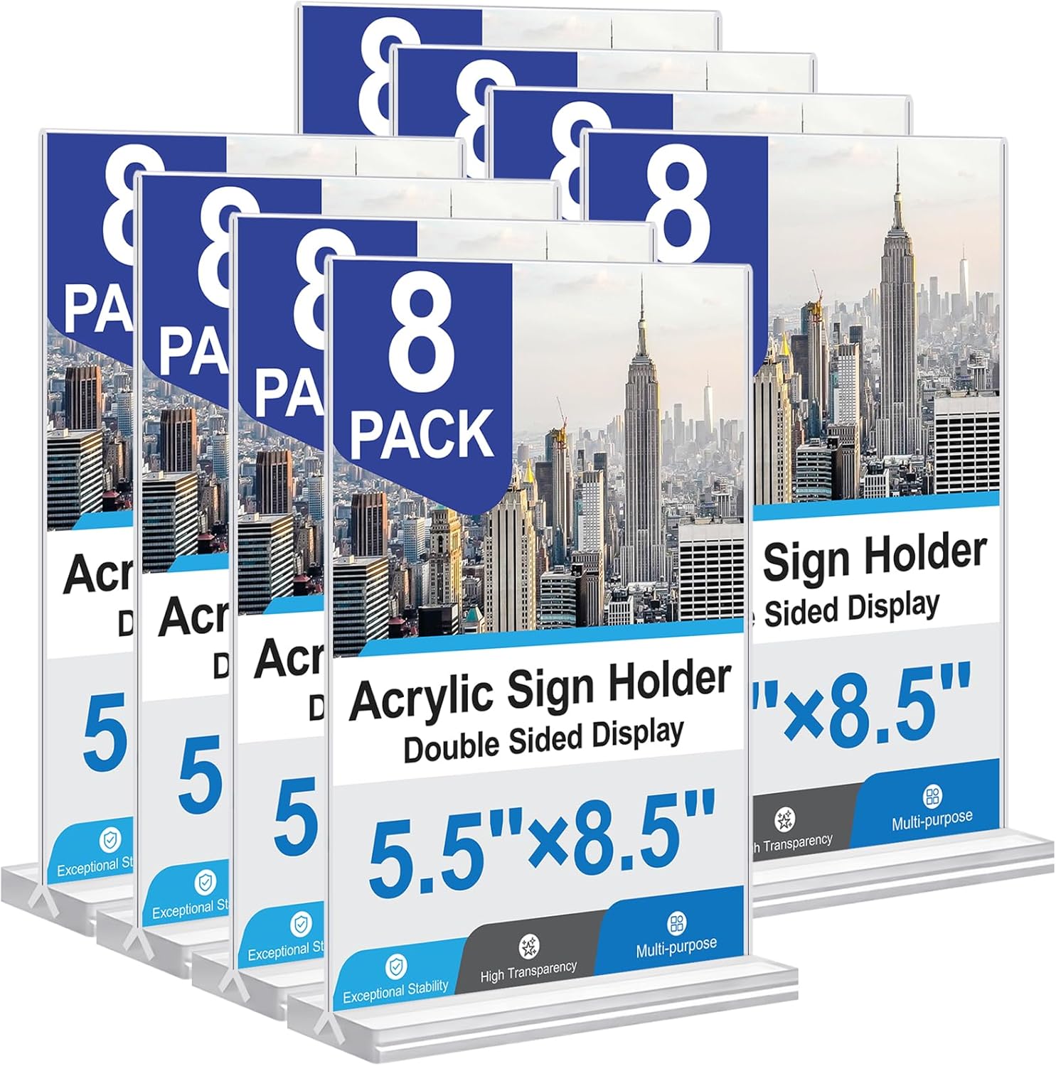 Acrylic Sign Holder 5.5x8.5 Inches 8 Pack, Double Sided Vertical Clear Display Stand, Plastic Frame Flyer Holder for Tabletop, Office, Restaurant, Store