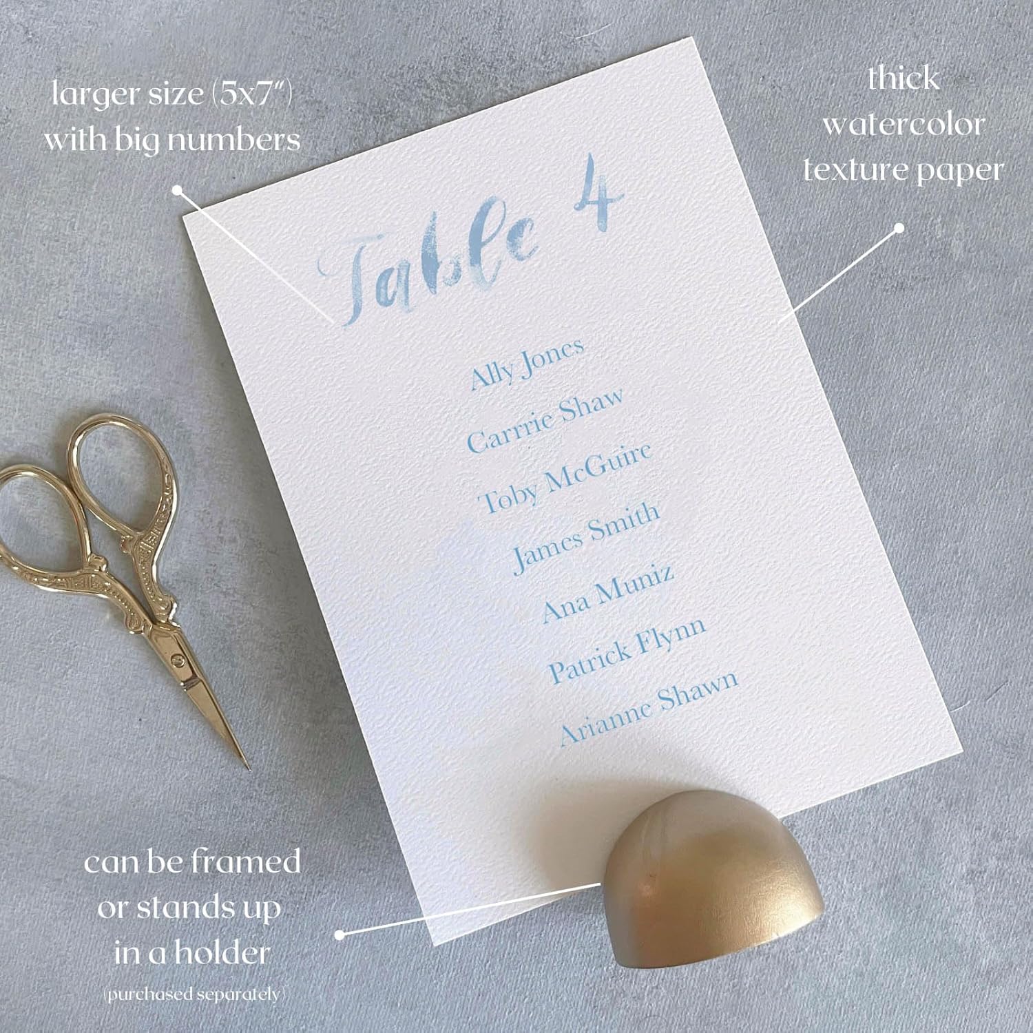 • These 5 x 7 " white and light blue table seating cards are larger than standard size 4x6" table numbers so your guests can see the large numbers and names with ease.