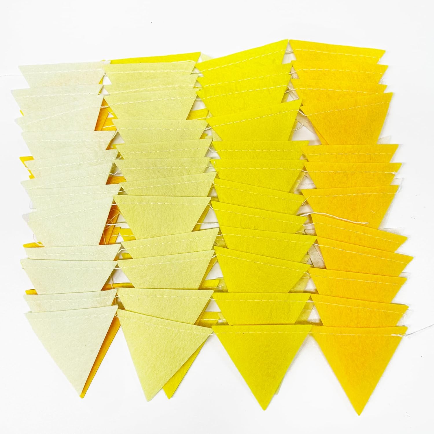• 🟡Easy Assembly - Easy hanging and reusable.Perfect fit for gradient yellow party decor.unroll and unwrap garland carefully. due to delicate nature of thread,may tangle.This yellow mini triangle pennant makes an attractive backdrop for videos and photos.