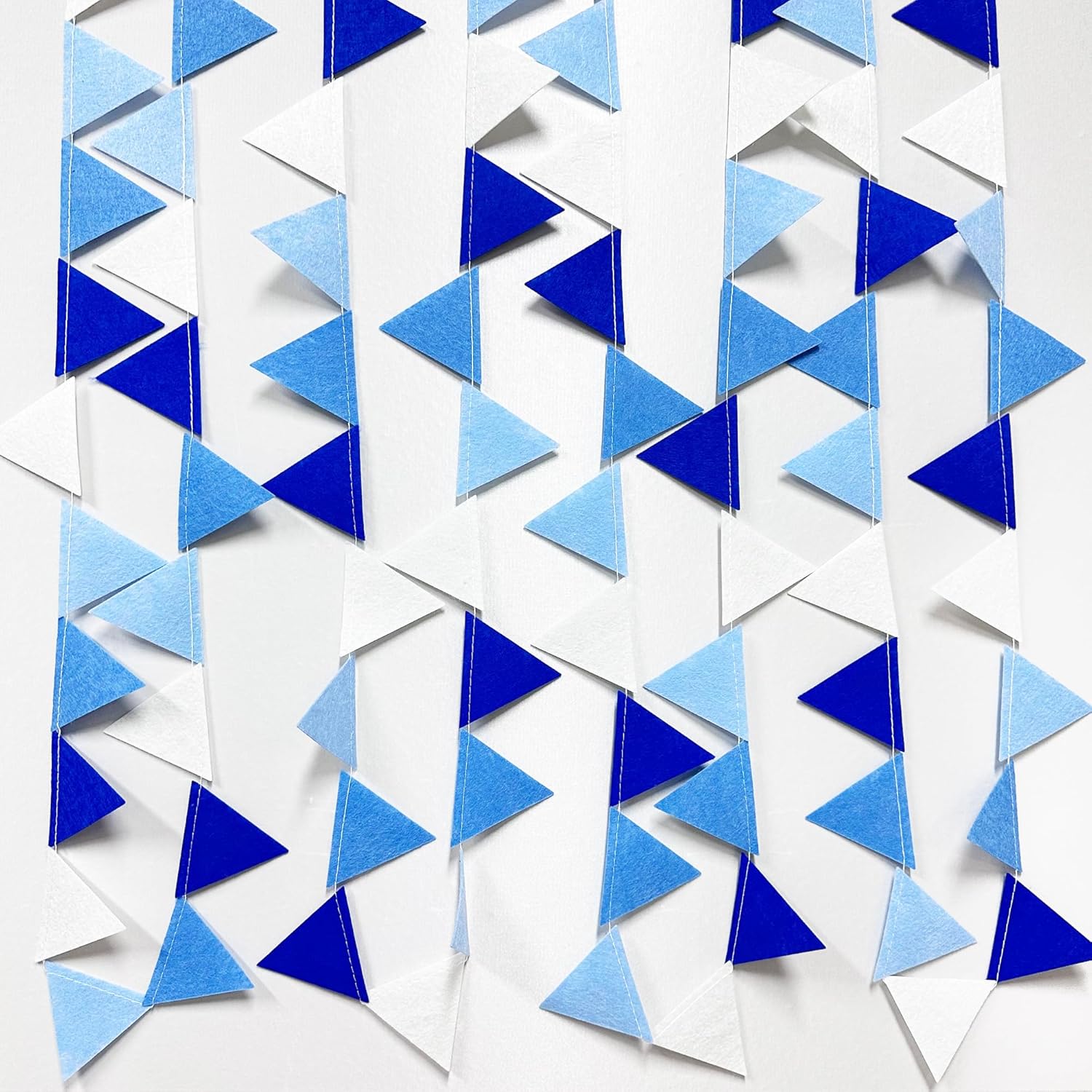 • 🔵Easy Assembly - Easy hanging and reusable.Perfect fit for gradient blue party decor.unroll and unwrap garland carefully. due to delicate nature of thread, may tangle.This blue mini triangle pennant makes an attractive backdrop for videos and photos.