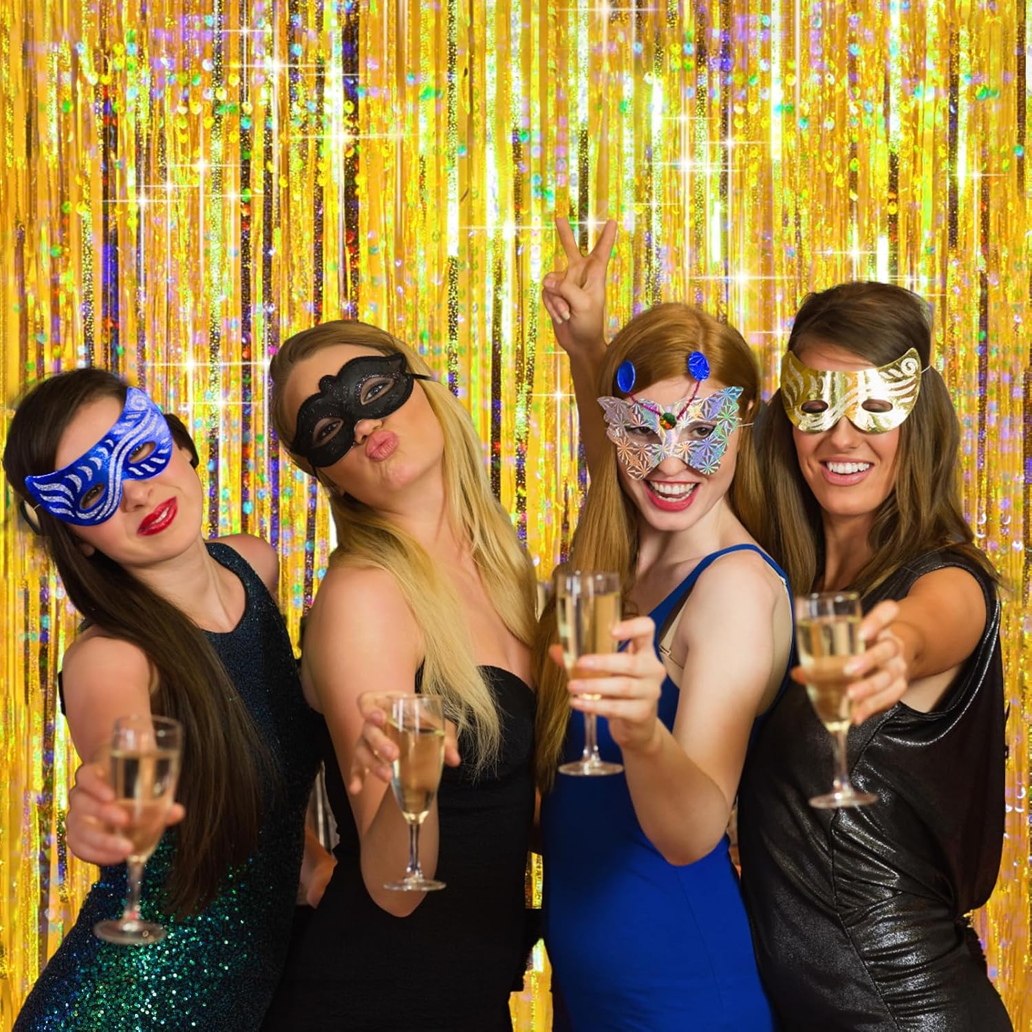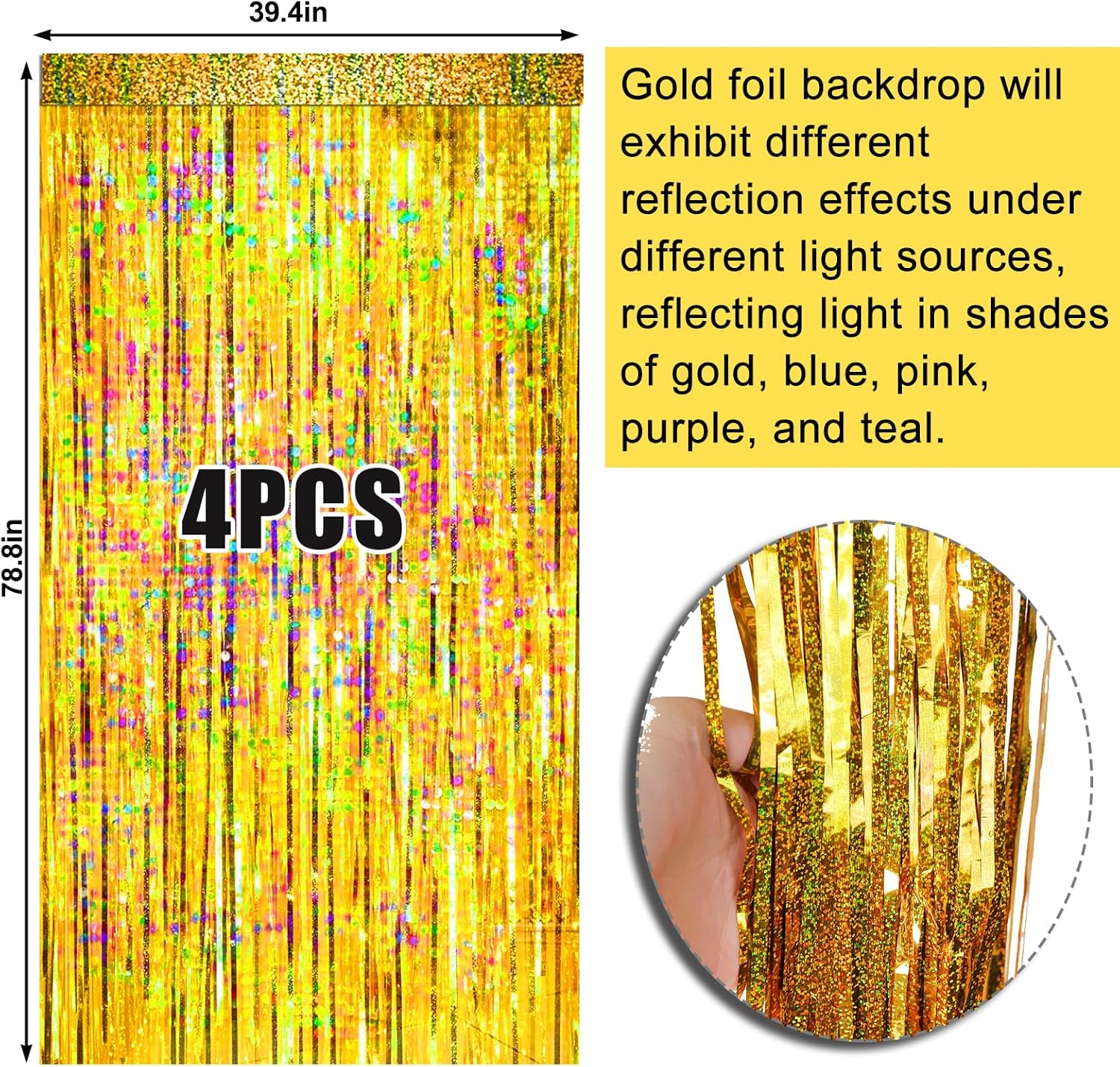 • Shiny Holographic Design: Different from usual gold backdrop, our fringe backdrop features a shiny holographic design, and it shows different color effects under different light, reflecting light in shades of gold, blue, pink, purple, and teal, that creates an eye-catching and mesmerizing effect. Perfect for the doorway, window, wall, living room, dessert table backdrop, and stage background decorations.