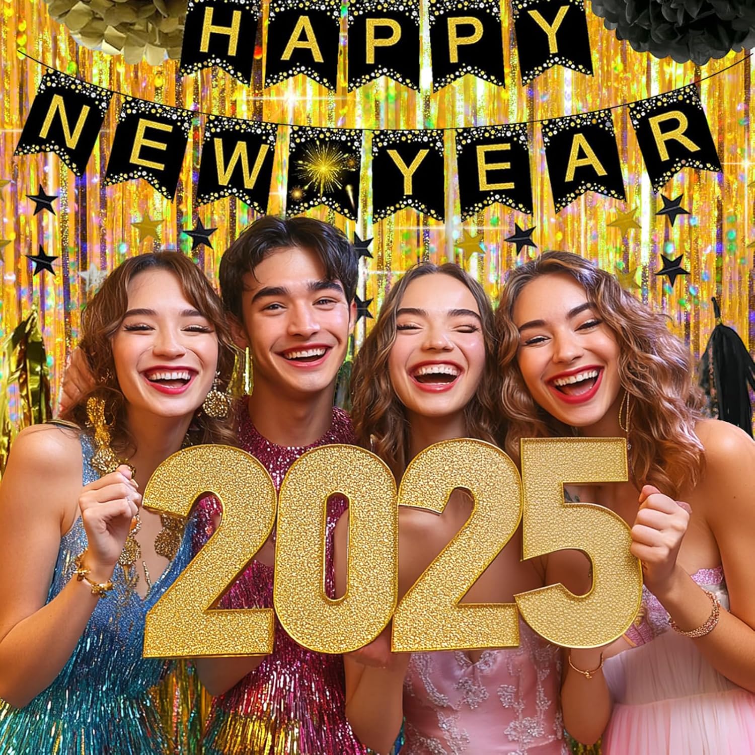• Shimmery Gold Fringe Backdrop: You will get 4 Pcs gold glitter tinsel backdrop. Size: 6.6ft*3.3ft. The foil fringe curtains are perfect for the door or wall to create an impressive decoration for parties, events, and photo booths.
