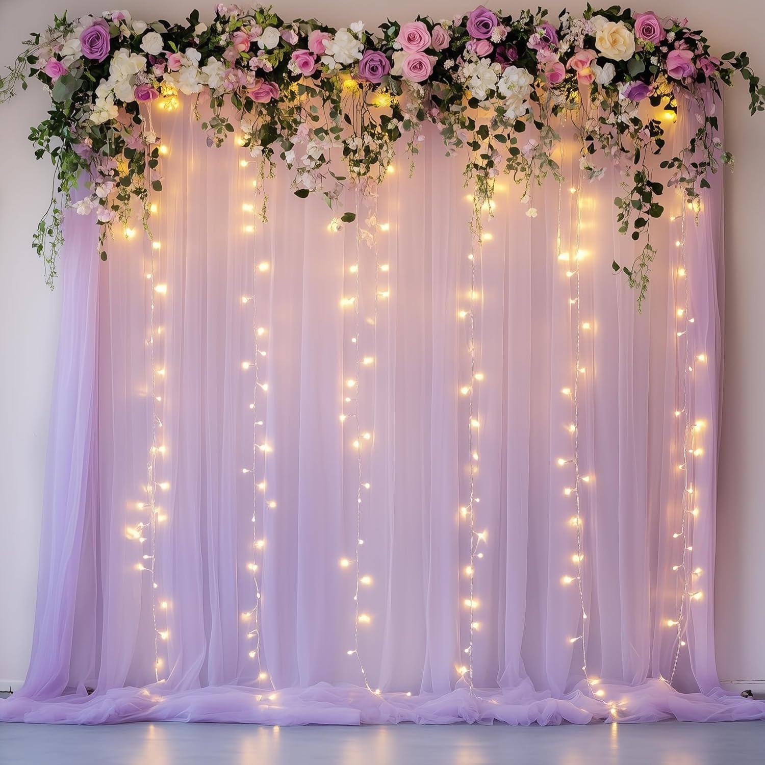 • Package Includes: 2 panels lavender tulle backdrop curtains, each sheer curtain backdrop is 5FT width and 8FT height. Also it includes a set of 10FT (10 strands) warm string light (USB powered,no remote control) and 12pcs transparent clips.