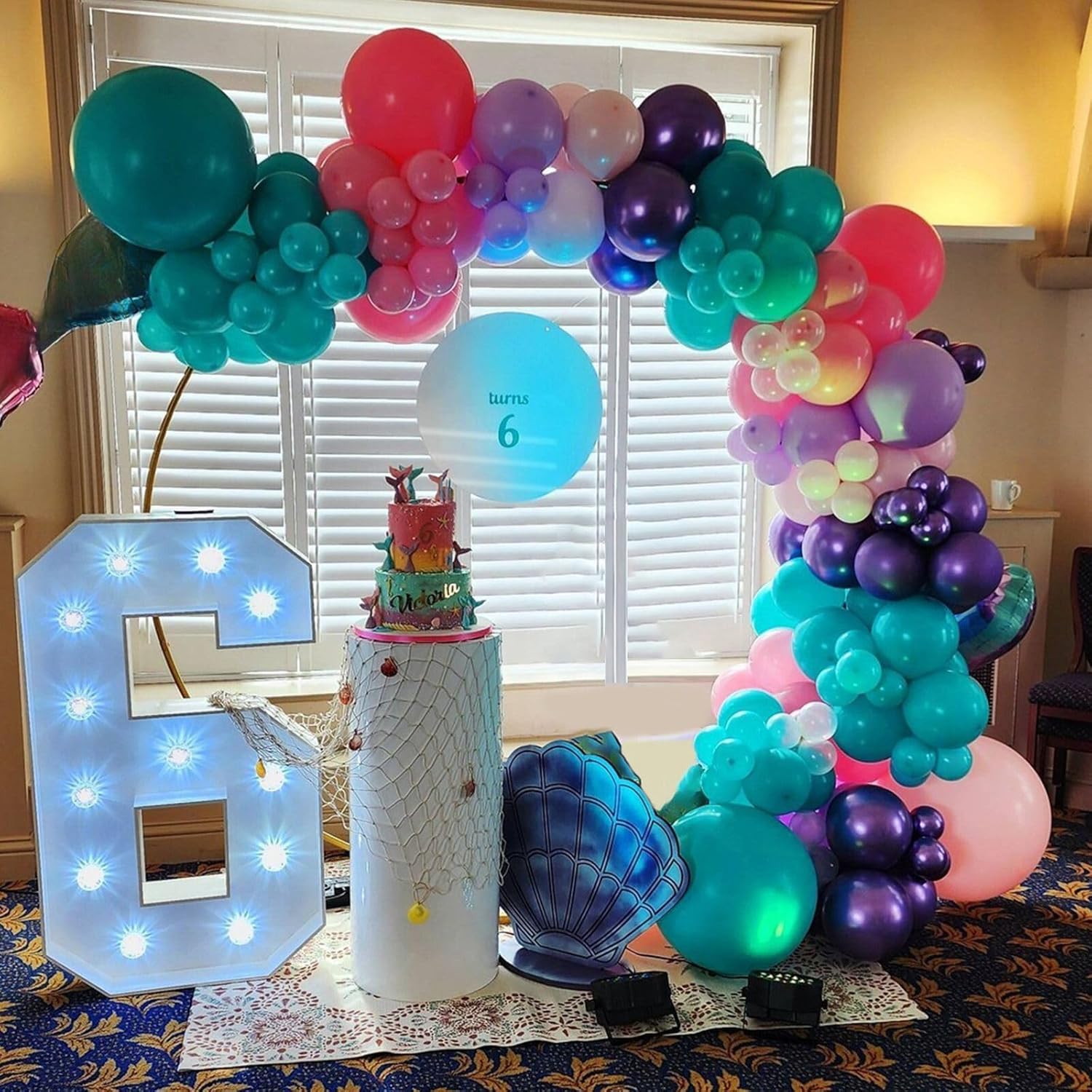 • 12 inch Teal Blue Purple Balloons: 52 Pcs pink purple balloons set including 10* hot pink balloons, 10* teal blue balloons, 10* maca pink balloons, 7* meatllic purple balloons, 7* pearl light purple balloons, 6* blue pink confetti balloons, 2* white ribbons. Whether it’s a baby shower, wedding birthday party, or any theme celebration, these balloons will bring a unique visual appeal to your venue