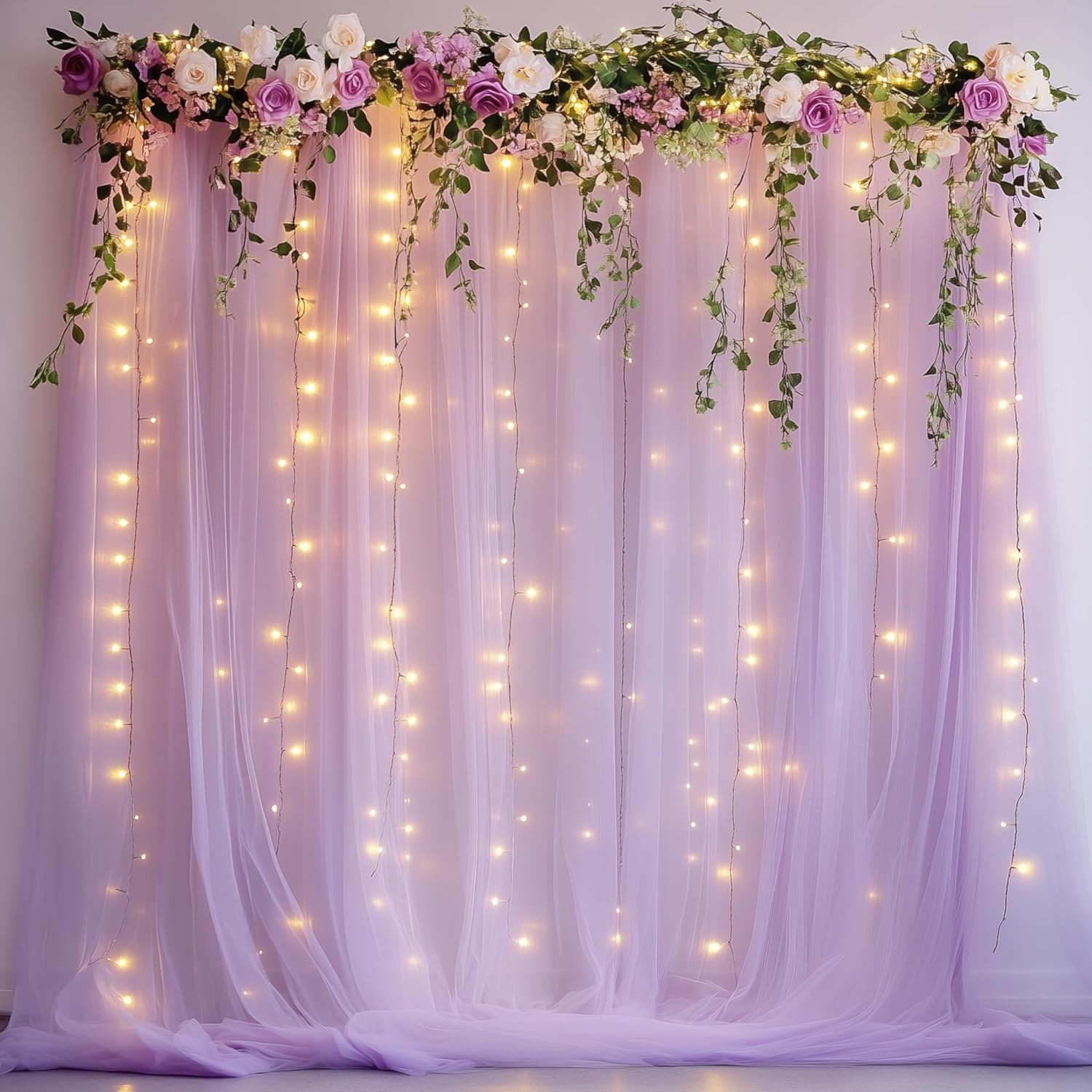 Fomcet Lavender Tulle Backdrop Curtains with Lights String 10FT X 10FT Sheer Curtain with Lights Tulle Curtains Backdrop for Wedding Birthday Party Photo Shoot (2 Panels 5x10FT)