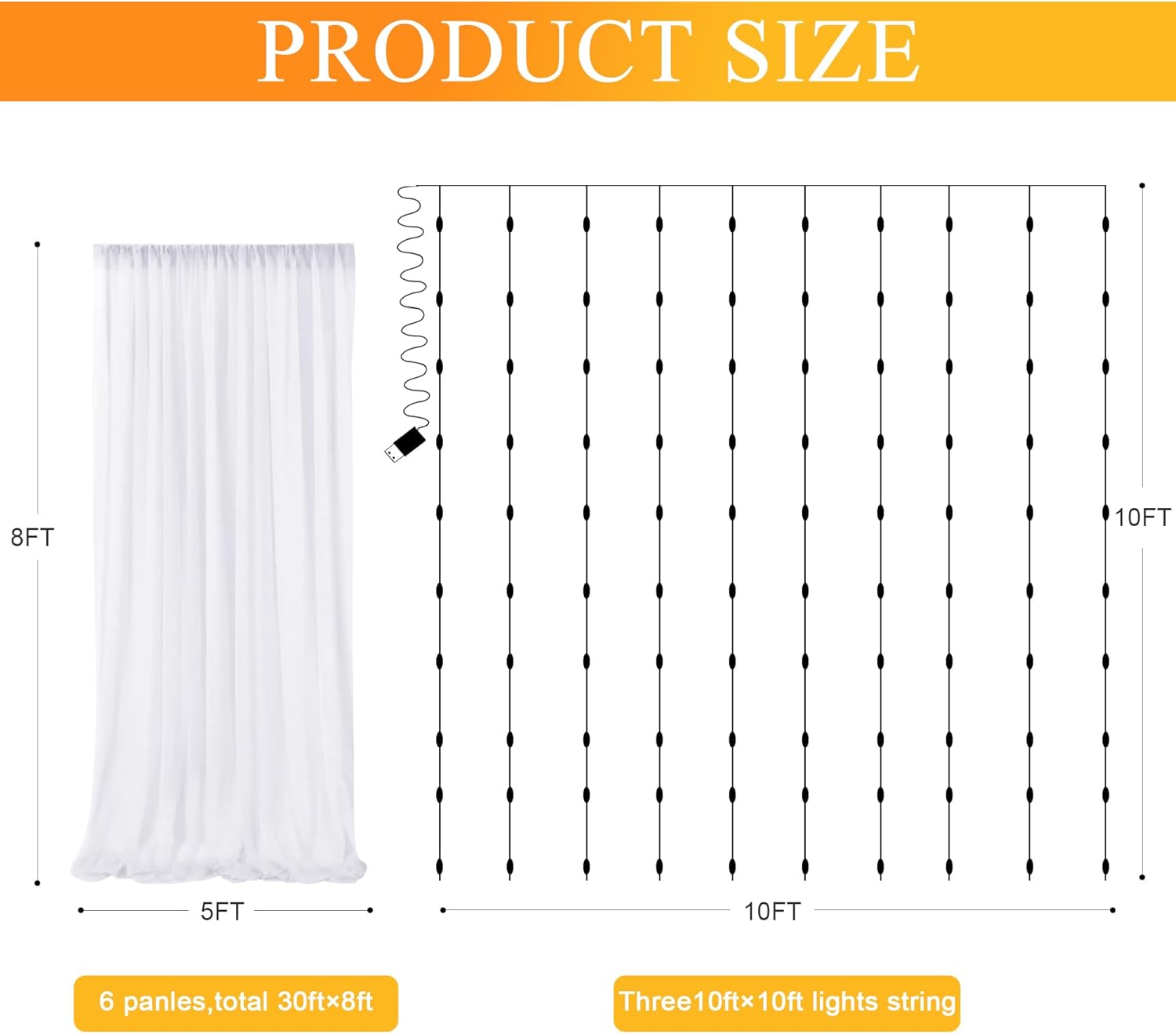 • Package Includes: The package includes 6 panels White sheer tulle backdrop curtains, each curtain backdrop is 5FT width and 8FT height. Also it includes 3 set of 10FT (10 strands) warm string light (USB Powered) and 36pcs transparent clips.