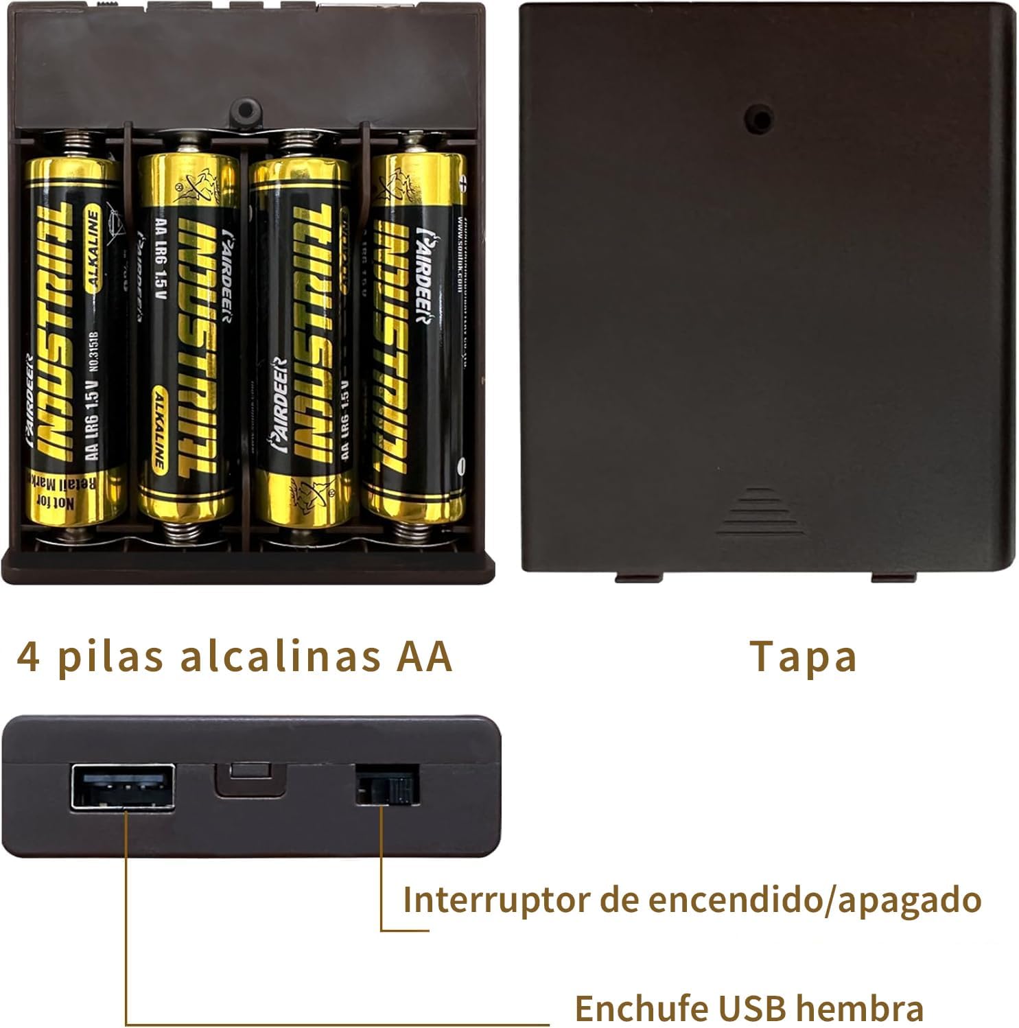 • 🎄【SAFE USB POWER SUPPLY】:1Pcs 4 AA batteries holder 6V with USB female socket and On/Off switch(Batteries Included),Also you can connect it with power bank, USB adapter, TV, phone charger and any others with USB port.