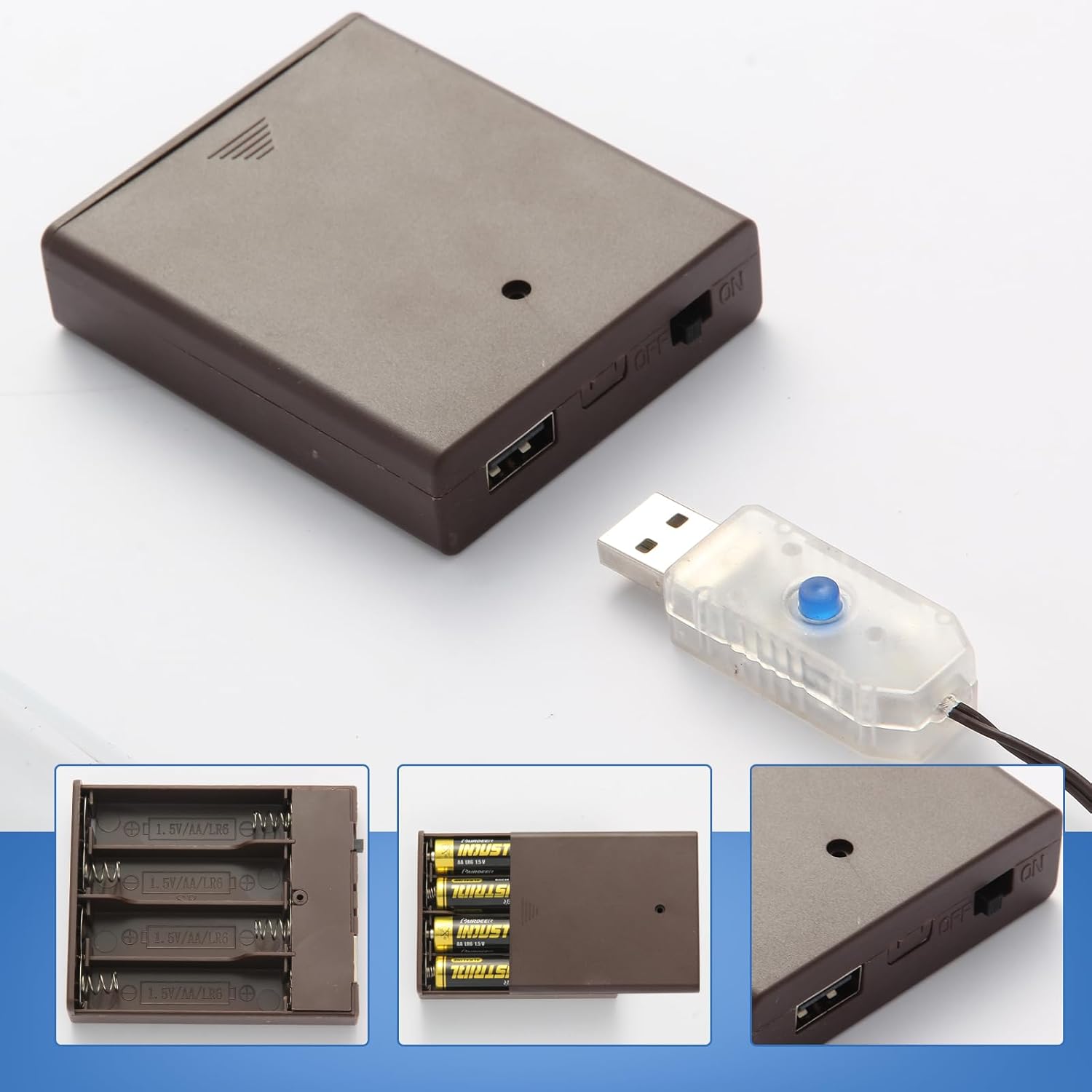 • 🎄【SAFE USB POWER SUPPLY】:1Pcs 4 AA batteries holder 6V with USB female socket and On/Off switch(Batteries Included),Also you can connect it with power bank, USB adapter, TV, phone charger and any others with USB port.