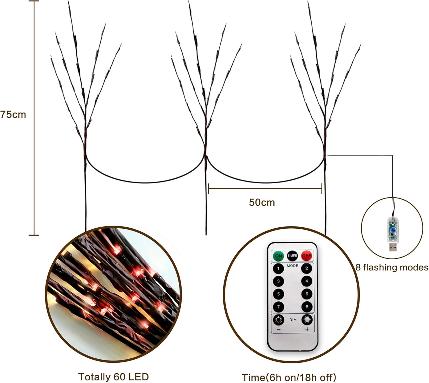 • 🎄【TWIG TREE LIGHT】3pcs branches are included,Each willow branch light comes with 5 bendable stems, 30 inches tall, 60 LED red color light bulbs are enough to create a relaxed and warm atmosphere.