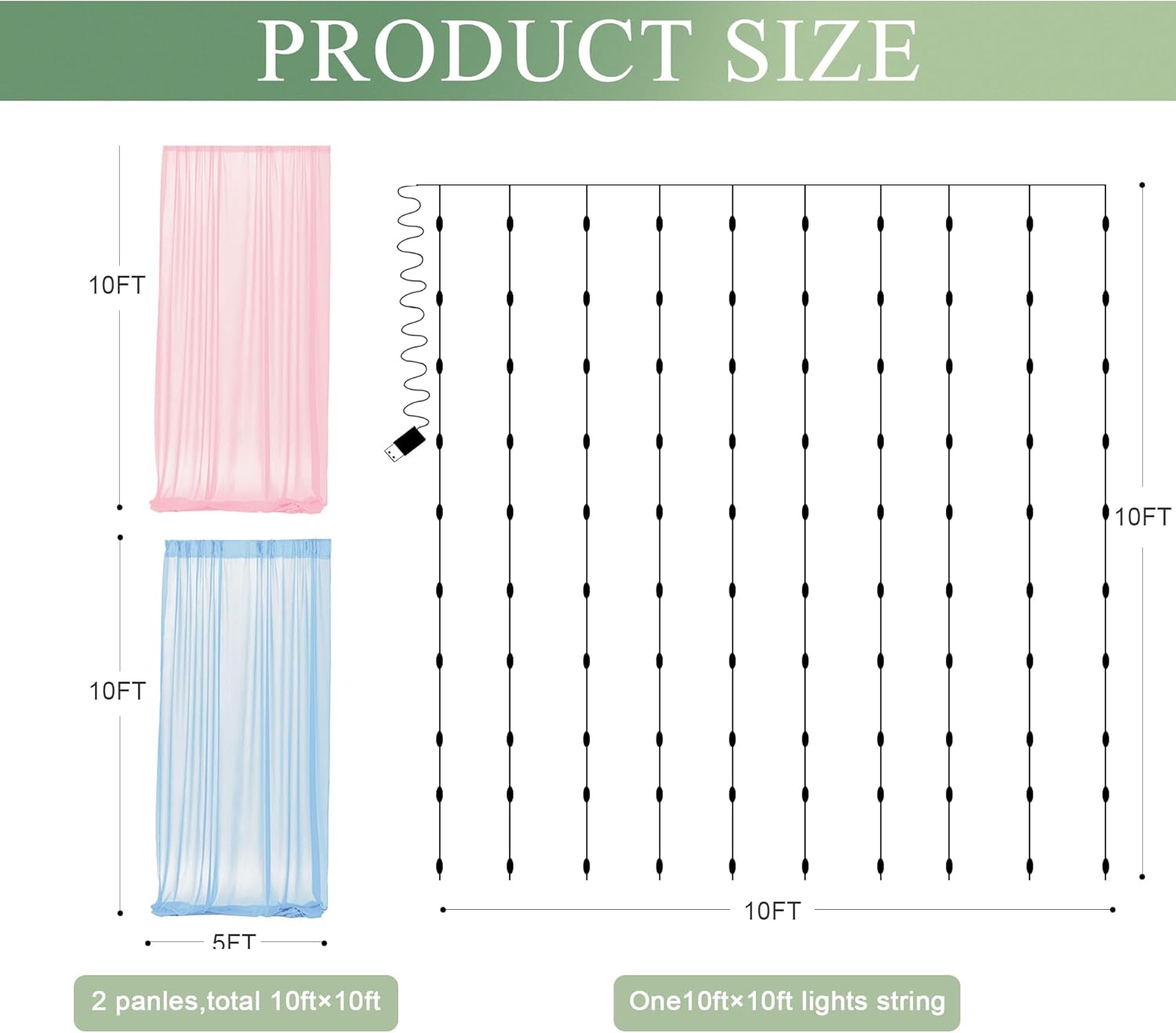 • Package Includes: The package includes 2 panels soft pink and blue curtain with lights, each panel tulle backdrop curtain size is 5FT width and 10FT height, a set of 10ft warm white string light (USB Powered) and 12pcs Transparent clips.