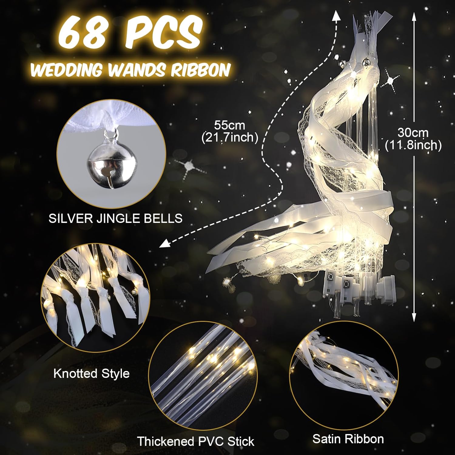 • LED Wedding Wands: We offer 68 white led wand, each adorned with four elegant white ribbons and a warm white LED light. At the top, a silver bell rings cheerfully with every wave. Glow-in-the-dark wands are ideal for long wedding send-offs.