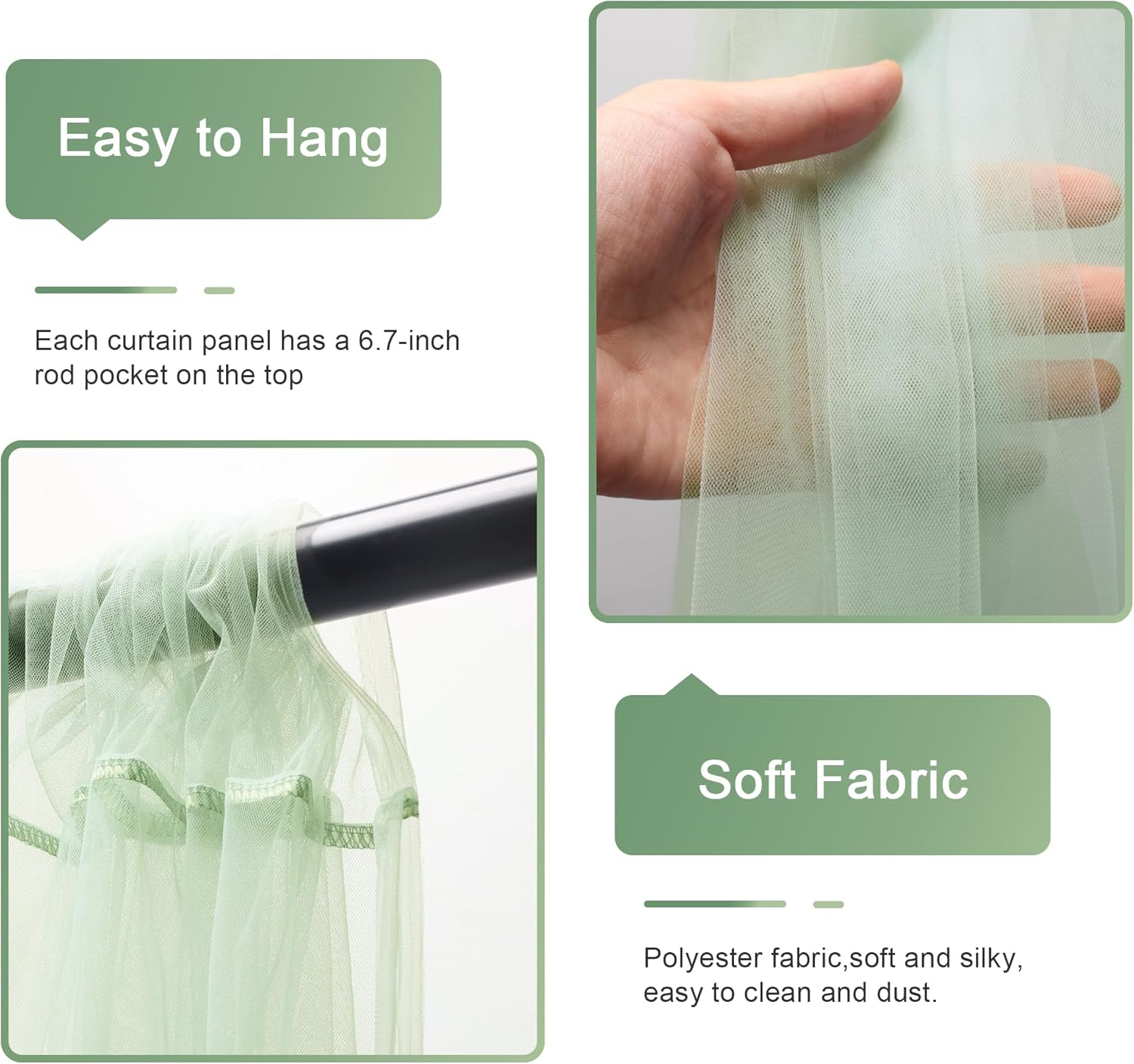 • Package Includes: The package includes 2 panels soft sage green curtain with lights, each panel tulle backdrop curtain size is 5FT width and 10FT height, a set of 10ft warm white string light (USB Powered) and 12pcs Transparent clips.