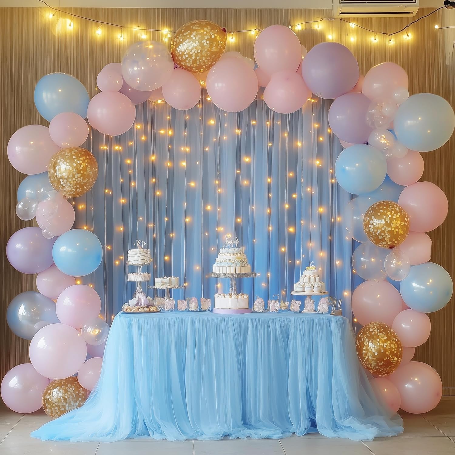 Tulle Backdrop Curtain with Lights String 10FT X 10FT Baby Blue Sheer Tulle Backdrop Curtains for Wedding Birthday Party Reception Photo Booth Background Decorations (2 Panels 5x10FT)