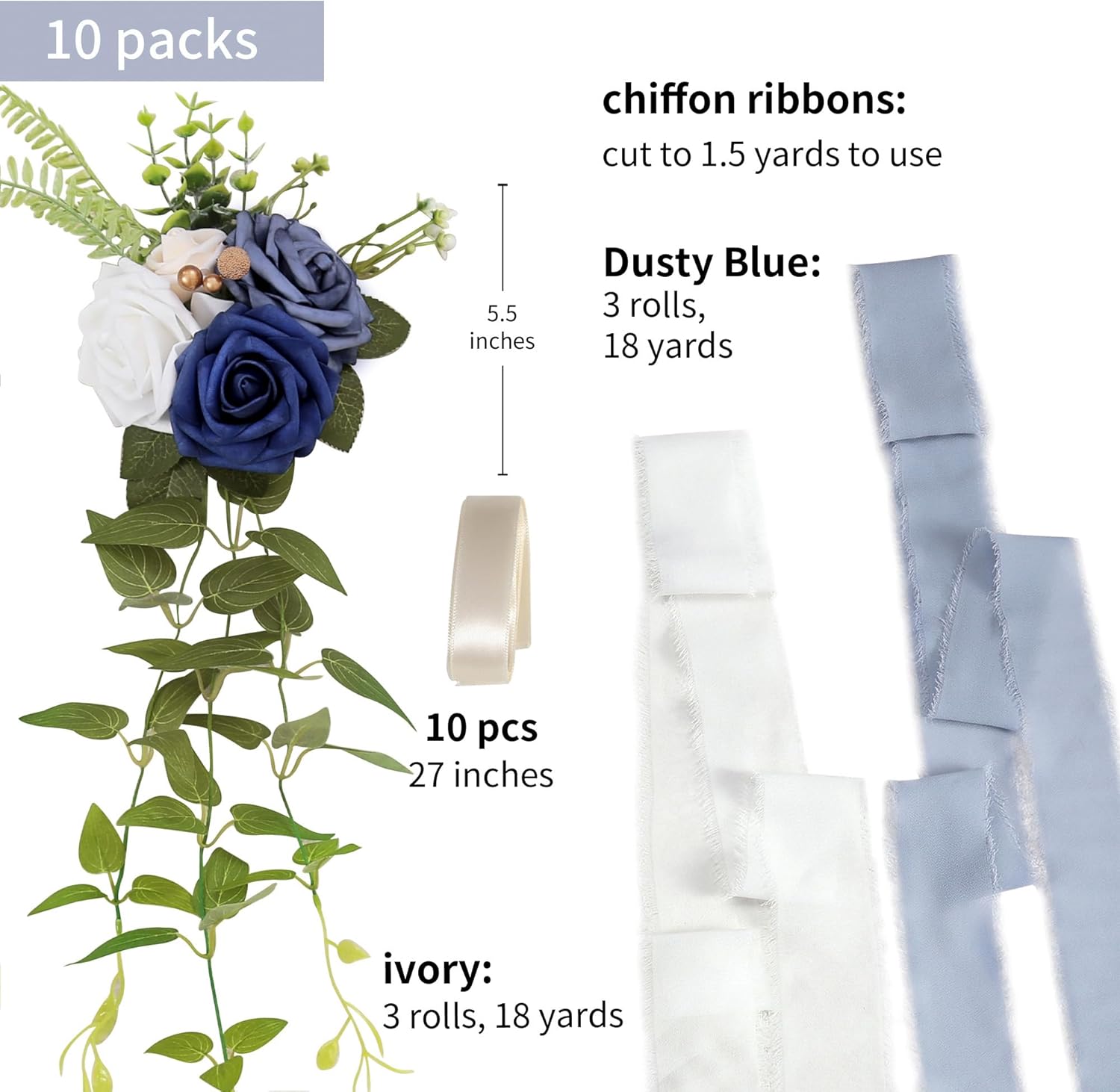 DORIS HOME Wedding Chair Decorations Blue Pew Flowers Set of 10 for Wedding Ceremony Party Aisle Decor with Artificial Flowers Eucalyptus and Ribbons