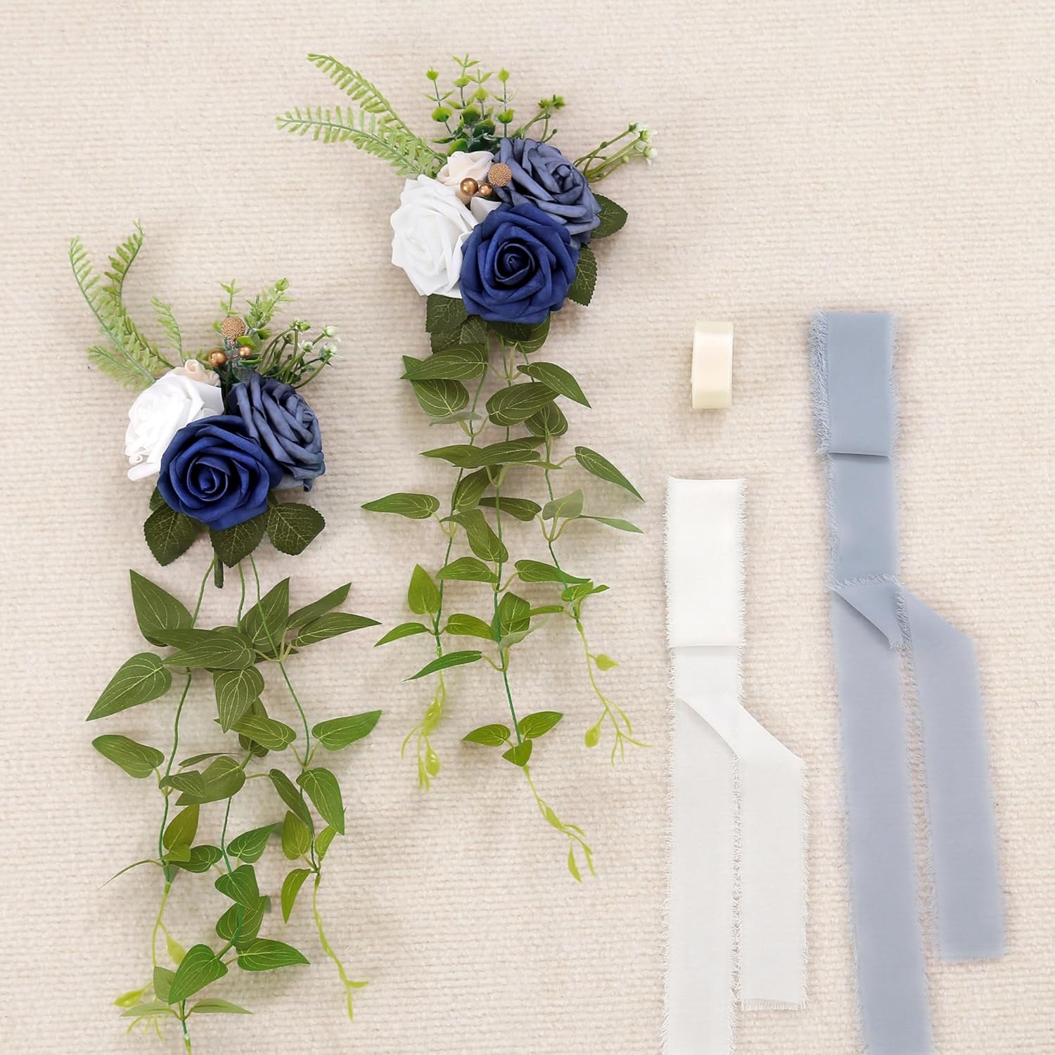• Details: open big dark blue / dusty blue / white roses, open small cream rose, gold beads, clematis leaves, green eucalyptus leaves make the whole pew flower approx 5.5" diameter; chiffon fabric drapes folded length 1.5yards, and the silk-like ribbons are ivory and dusty blue; extra one 70cm ribbon attached for easy tying.