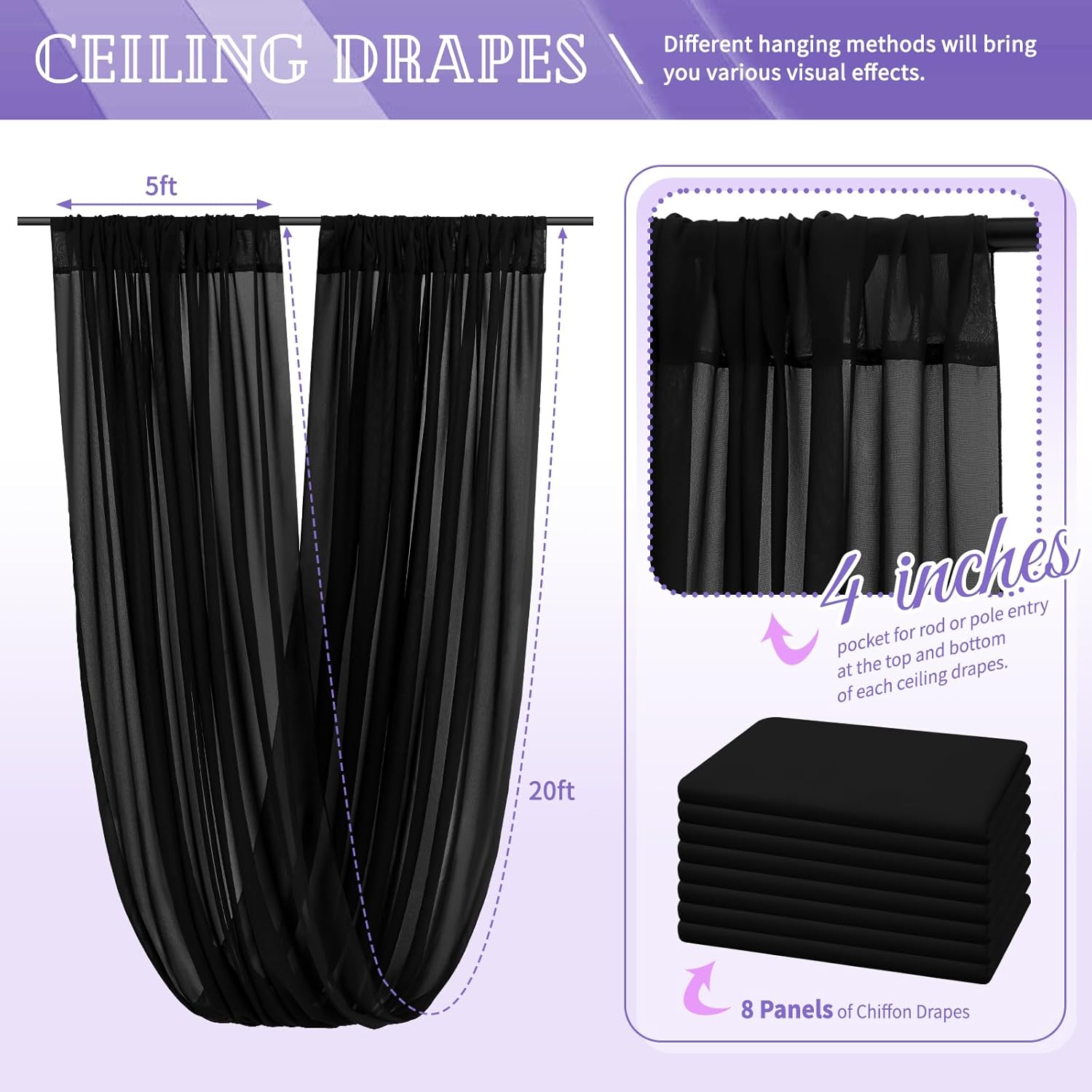 • 【Chiffon Fabric Curtain】The package will include 8 panels black wedding ceiling drapes (Not include stand !!!), each wedding extra long curtain measures 5 feet(60inch)wide x20 feet(240inch) long. Sufficient quantity can meet your needs. These arch draping are applicable for any indoor and outdoor occasion either for decorative or functional uses.