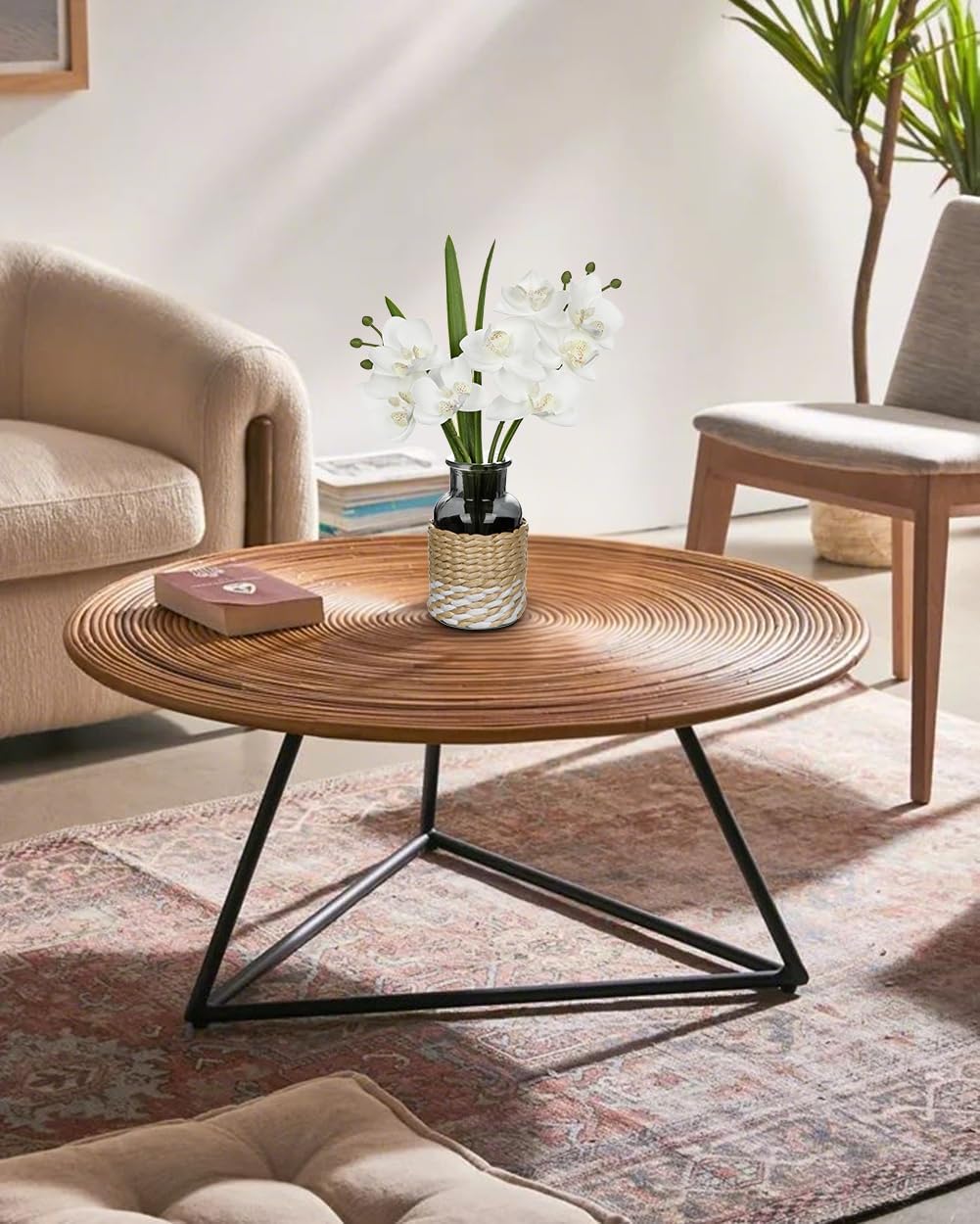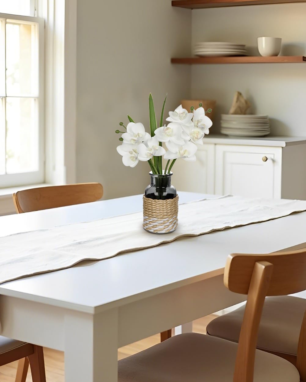 • Artificial Orchids with Vase - This white orchids for centerpieces has 8 eye-catching bloomed white orchid flowers, with lifelike orchid branche, leaves and buds, are displayed in a black glass vase perfectly, which wrapped in hand-woven jute twine , it enhance the taste of home decoration.This white orchids arrangements is an ideal gift for your lovers/family/friends on Mother's Day, Anniversary, Housewarmings, Birthday (the orchid branches cannot be takend out)