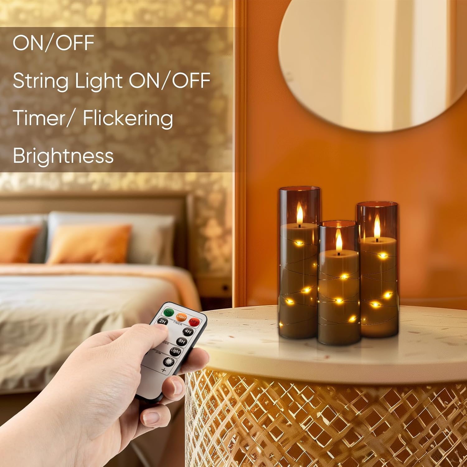 • Equipped with Remote Control: The smart 10-key remote control makes the operation more convenient and flexible. You can freely adjust the brightness, switch candles on and off, light modes and set timers within a 50-foot range.