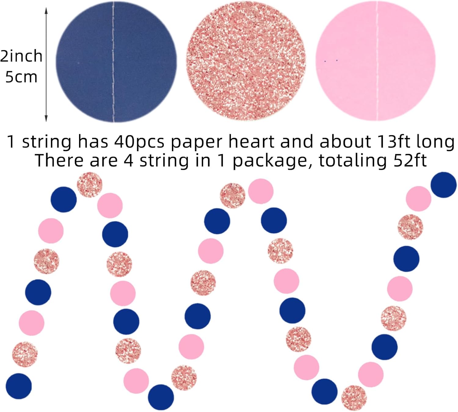 • 【 streamers party decorations 】The decorations kit include 4 pack paper streamer garland in 3 colors navy blue pink and Rose Gold,each garland is approx 13 feet in length,totally 52 feet in length.Each one has 40 pieces of circle dots 1.97".